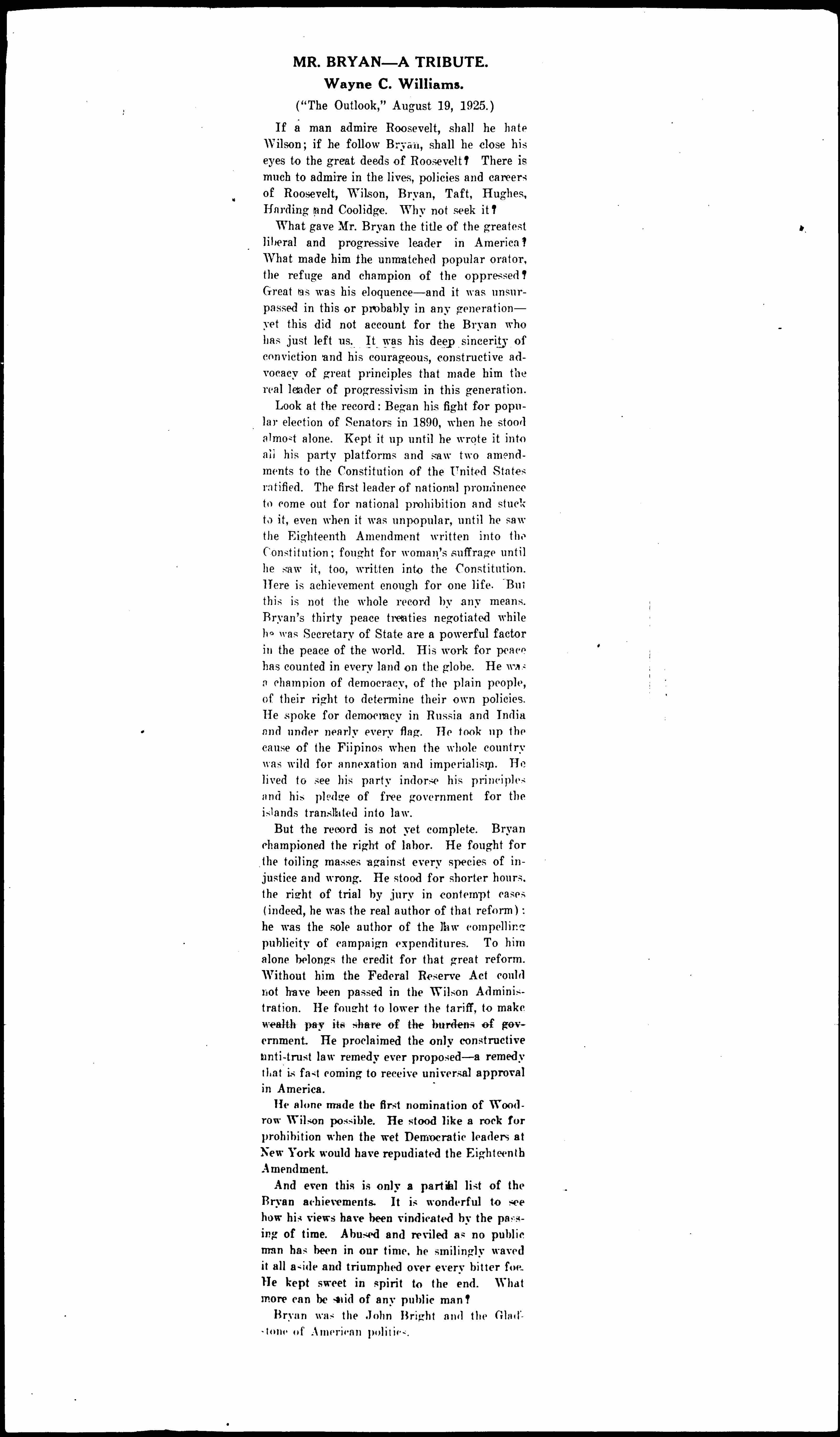 Bryan's thirty peace treaties negotiated while he was Secretary of State are a powerful factor in the peace of the world. His work for peace has counted in every land on the globe. He was a champion of democracy, of the plain people, of their right to determine their own policies. He spoke for democracy in Russia and India and under nearly every flag. He took up the cause of the Filipinos when the whole country was wild for annexation and imperialism. He lived to see his party [endorse] his principles and his pledge of free government for the islands translated into law.