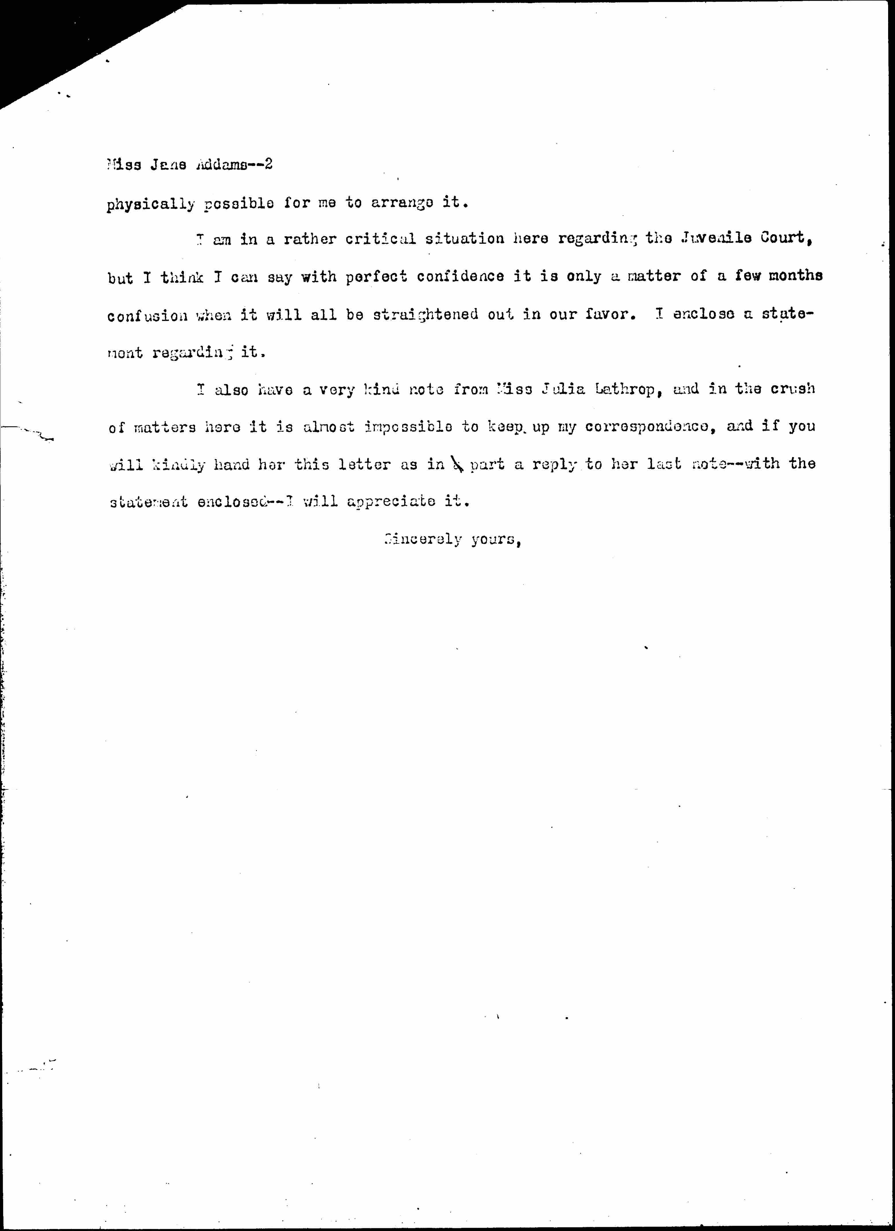I also have a very kind note from Miss Julia Lathrop, and in the crush of matters here it is almost impossible to keep up my correspondence, and if you will kindly hand her this letter as in a part a reply to her last note -- with the statement enclosed -- I will appreciate it.