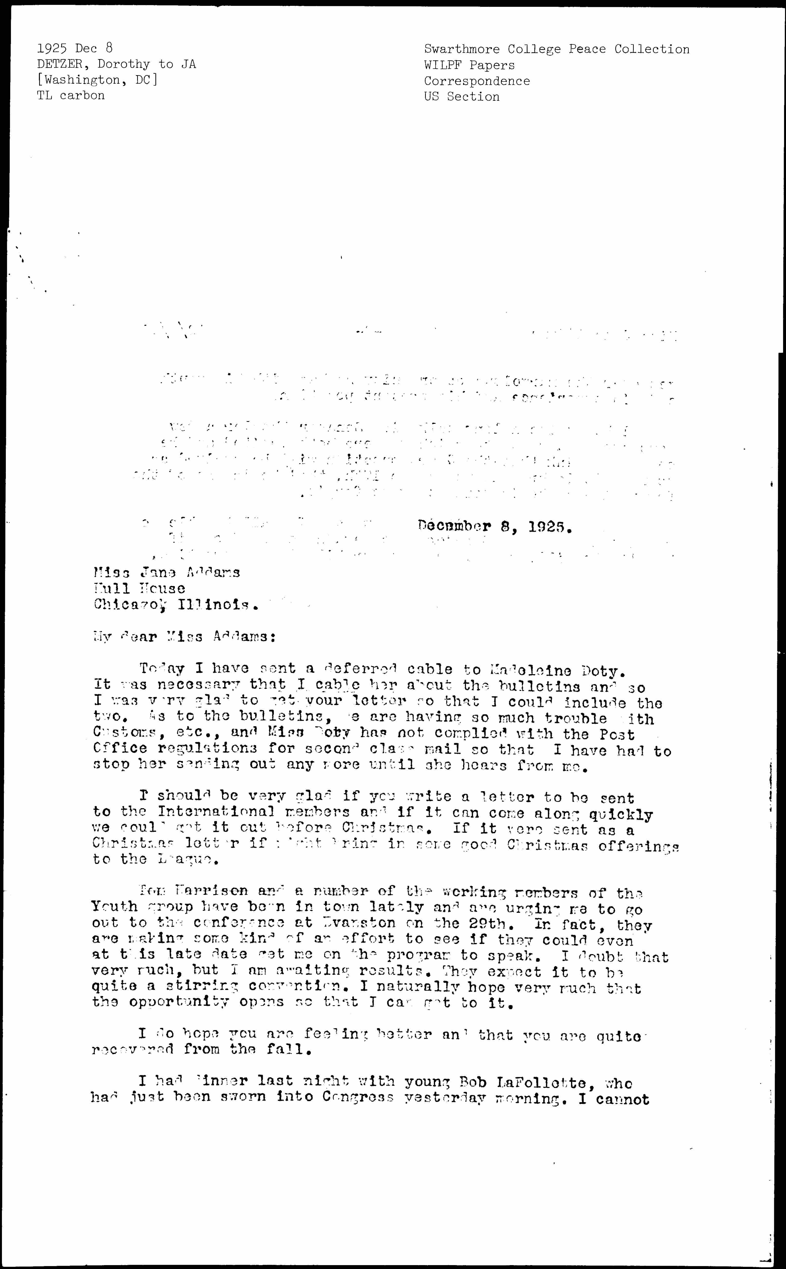 I had dinner last night with young Bob La Follette, who had just been sworn into Congress yesterday morning. I cannot [page 2] get over the marvelous opportunity he has with his youth and his experience and his present position.