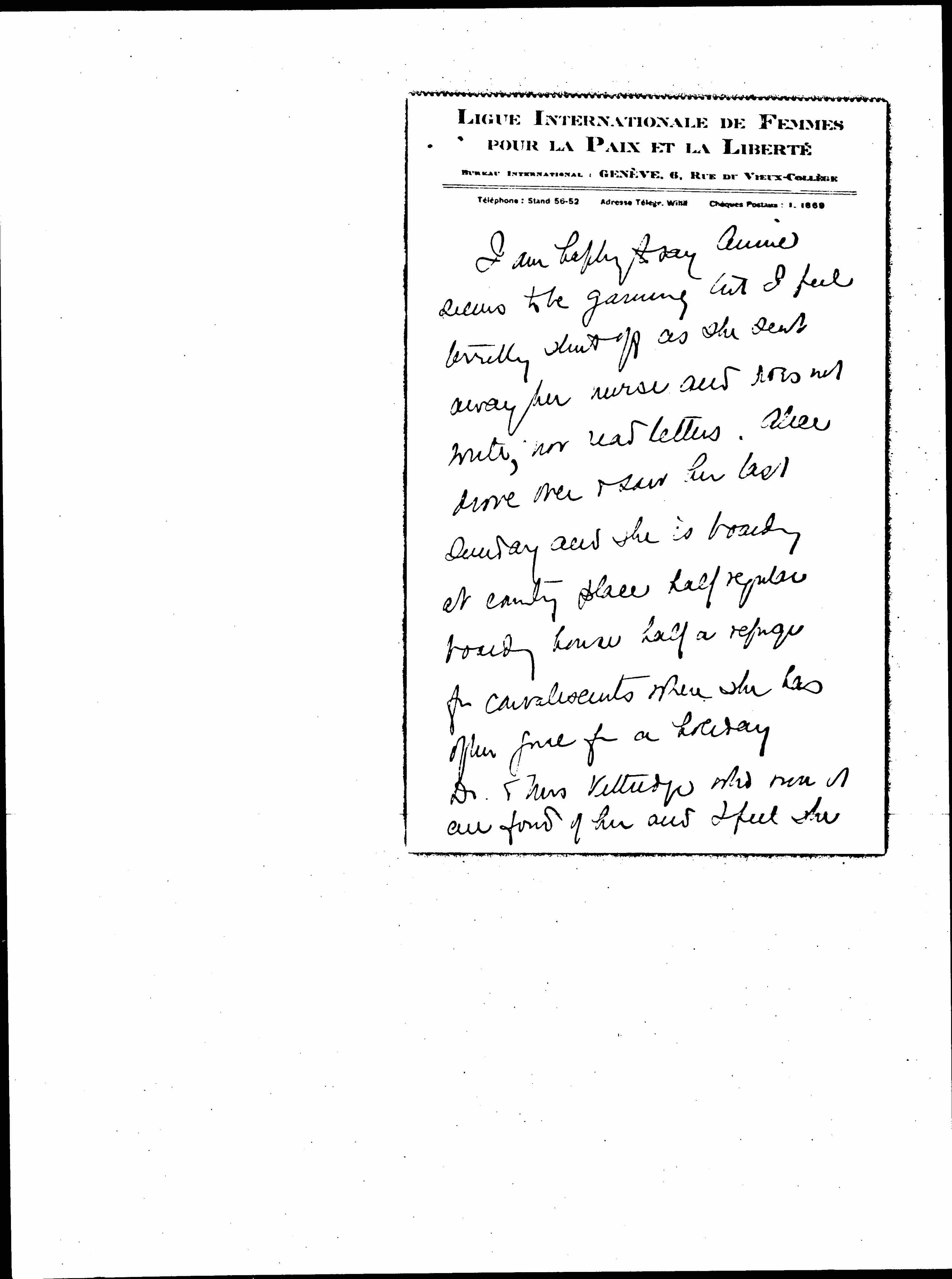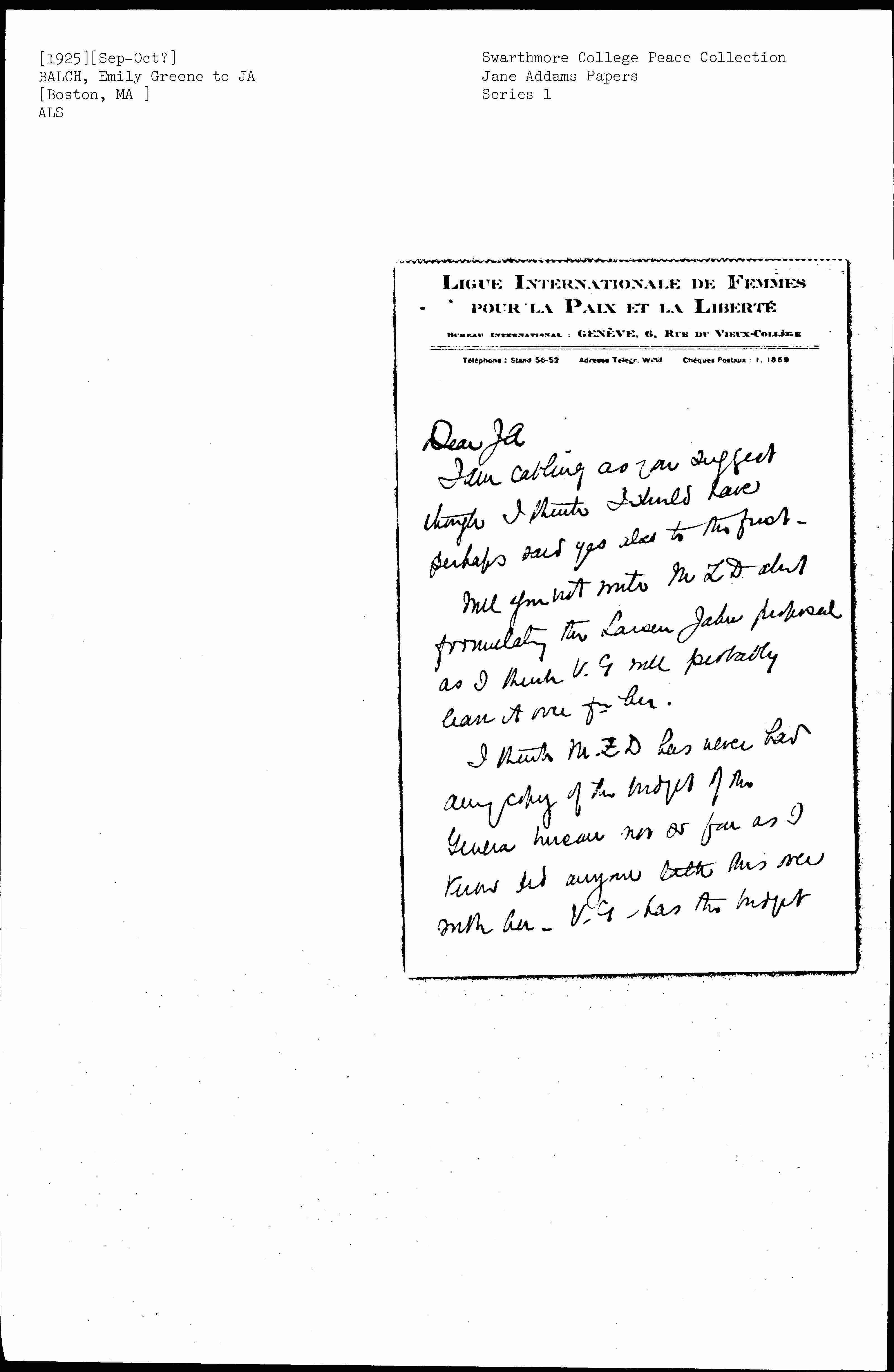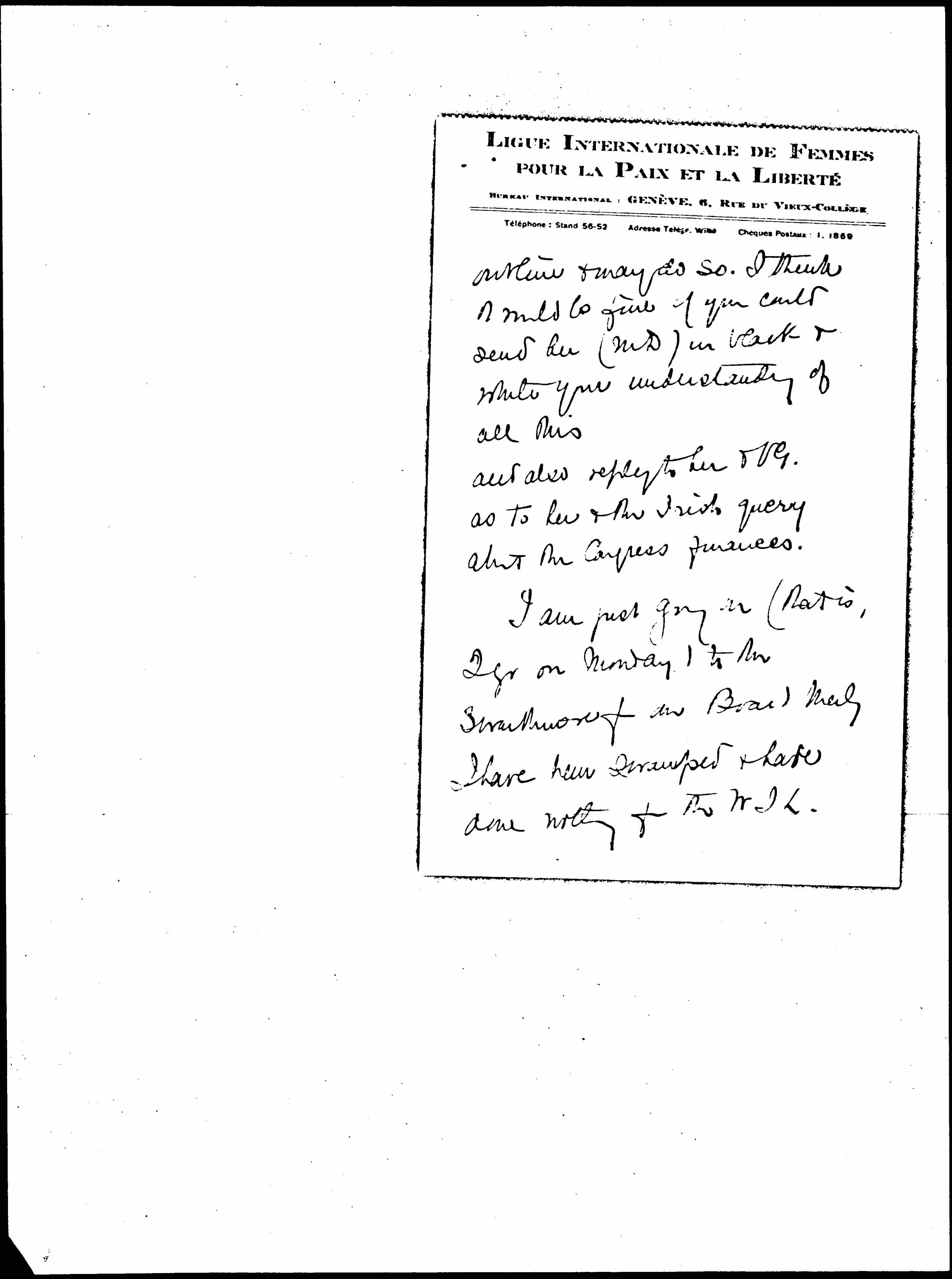 I am just going on (that is, I go on Monday) to [the?] Swarthmore for our Board [Meeting]. I have been swamped & have done nothing for the WIL. [page 3] so that Edith Hilles' plan works not only to inhibit D. D.