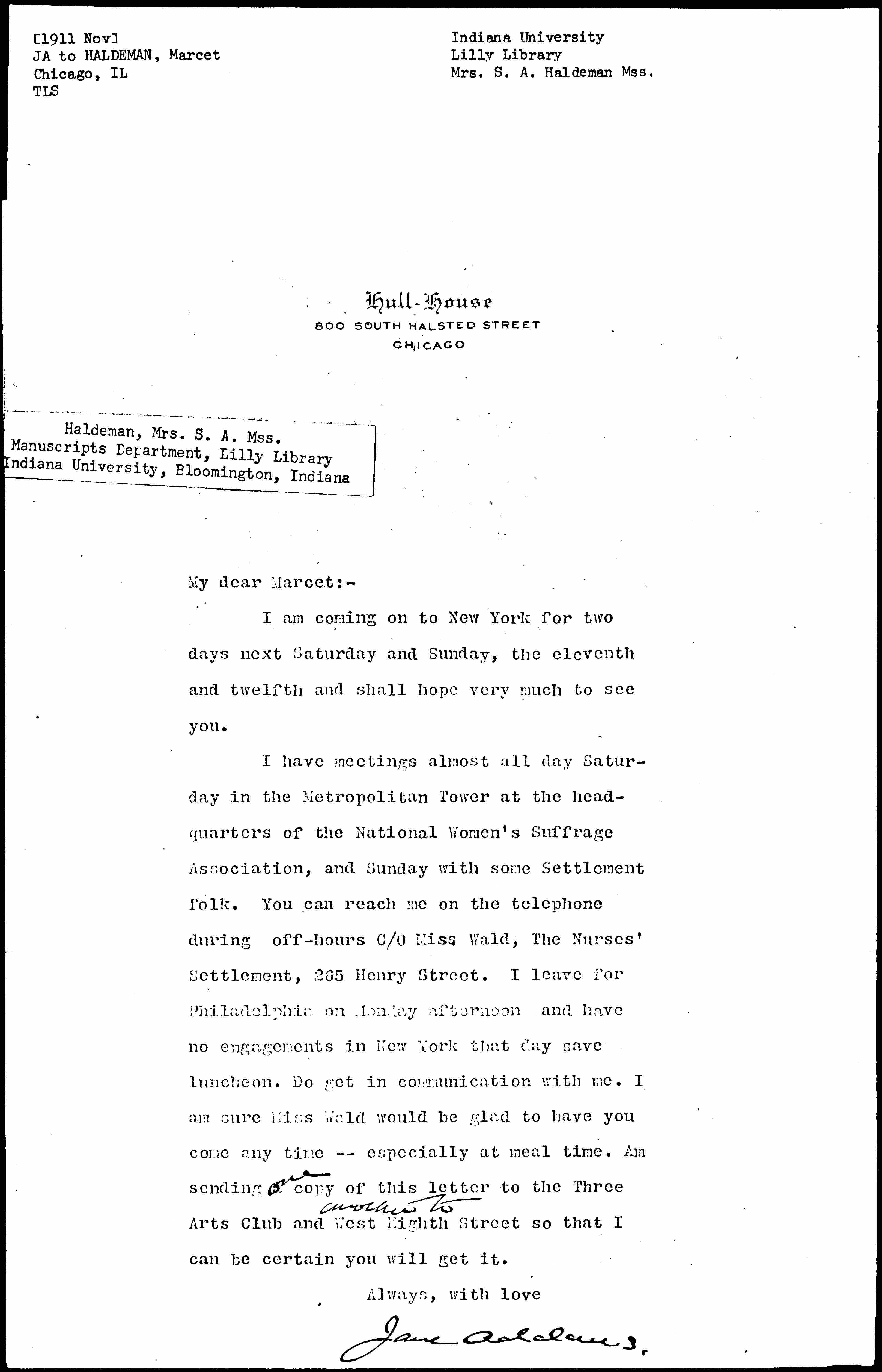 I have meetings almost all day Saturday in the Metropolitan Tower at the headquarters of the National Women's Suffrage Association, and Sunday with some Settlement folk. You can reach me on the telephone during off-hours C/O Miss Wald, The Nurses' Settlement, 265 Henry Street. I leave for Philadelphia on Monday afternoon and have no engagements in New York that day save luncheon. Do get in communication with me. I am sure Miss Wald would be glad to have you come any time — especially at meal time. Am sending <one> copy of this letter to the Three Arts Club and <another to> West Eighth Street so that I can be certain you will get it.