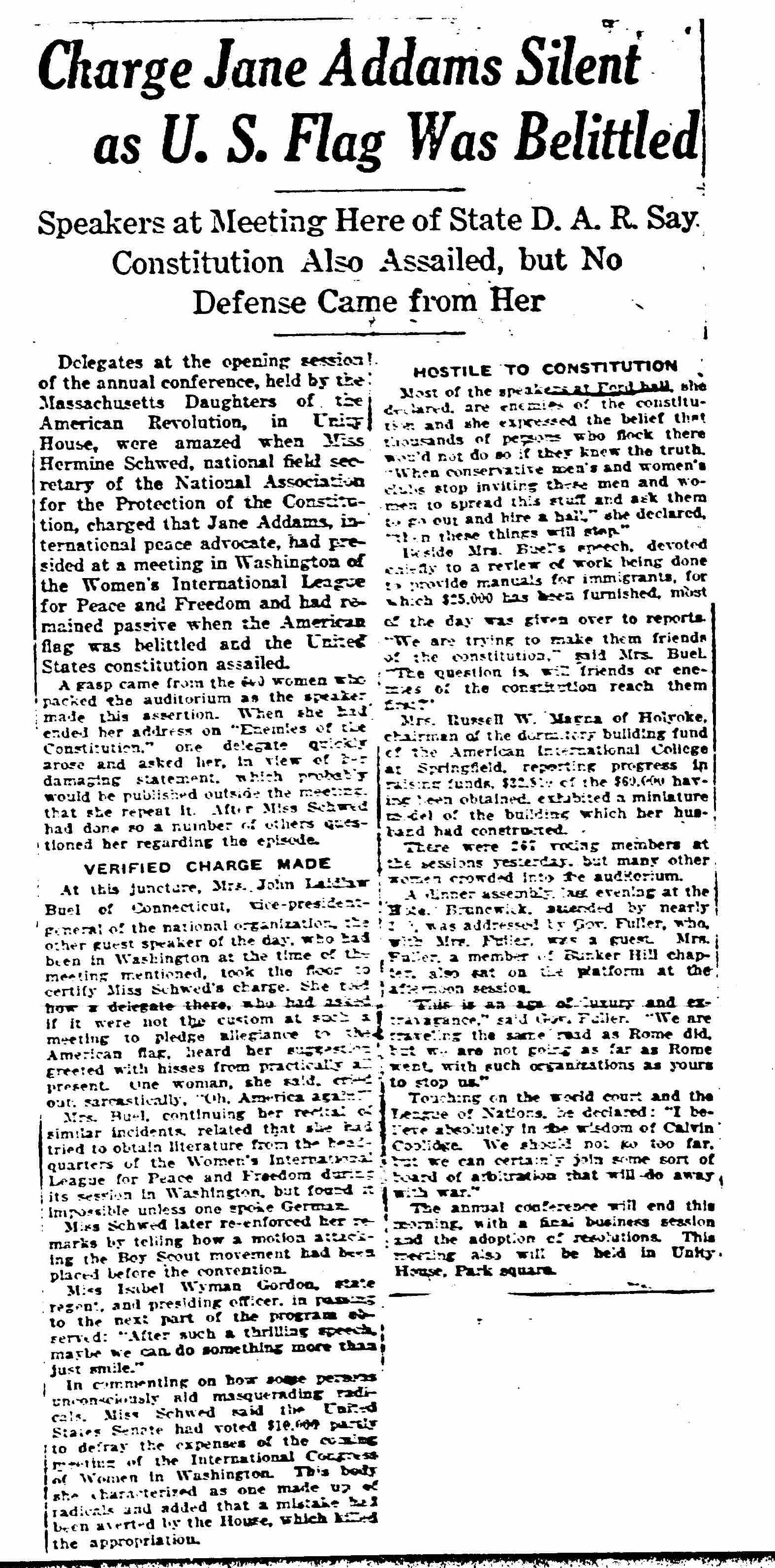 Charge Jane Addams Silent as U.S. Flag Was Belittled, ca. March 18, 1925