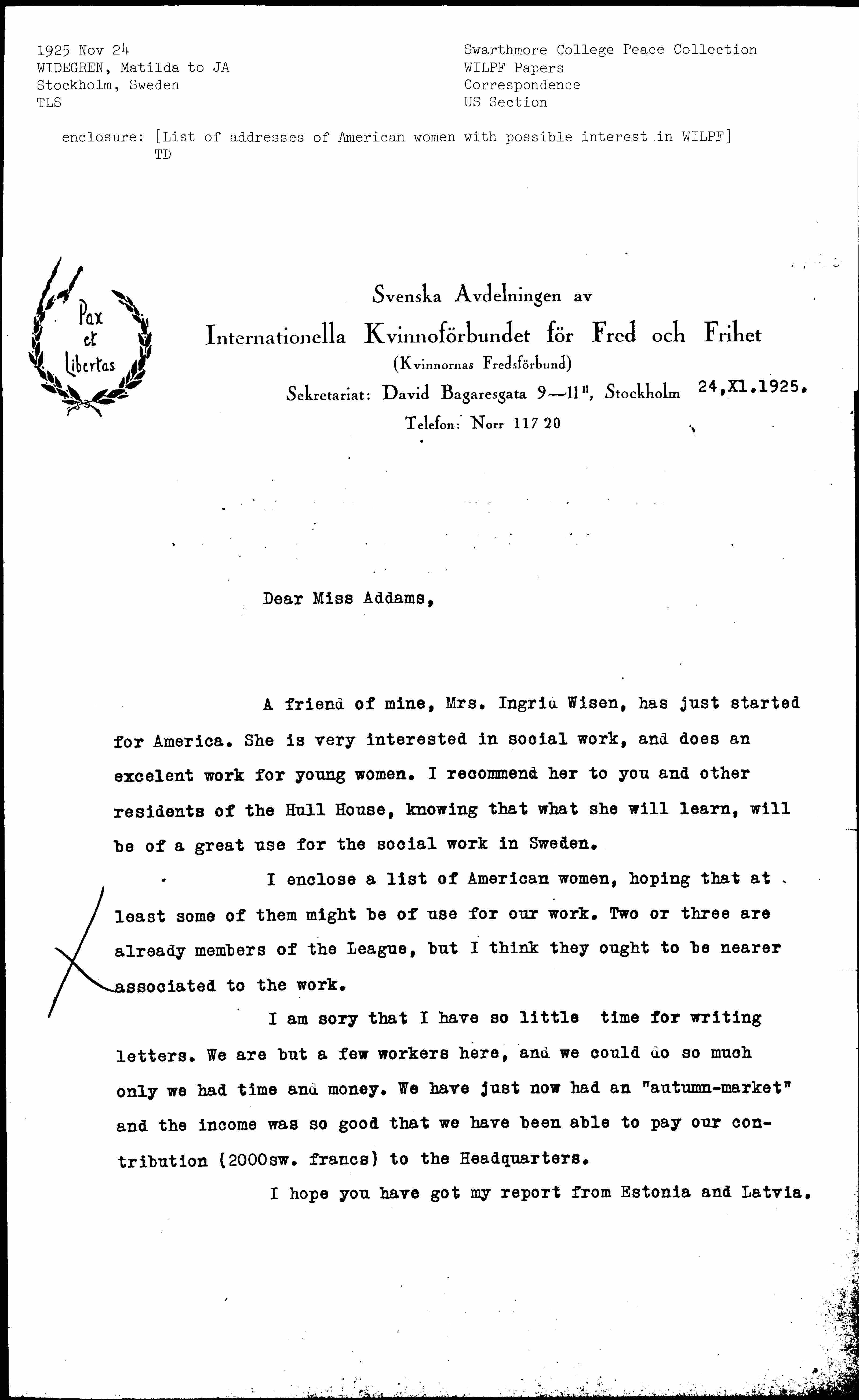 A friend of mine, Mrs. Ingrid Wisen, has just started for America. She is very interested in social work, and does an [excellent] work for young women. I recommend her to you and other residents of the Hull House, knowing that what she will learn, will be of a great use for the social work in Sweden.