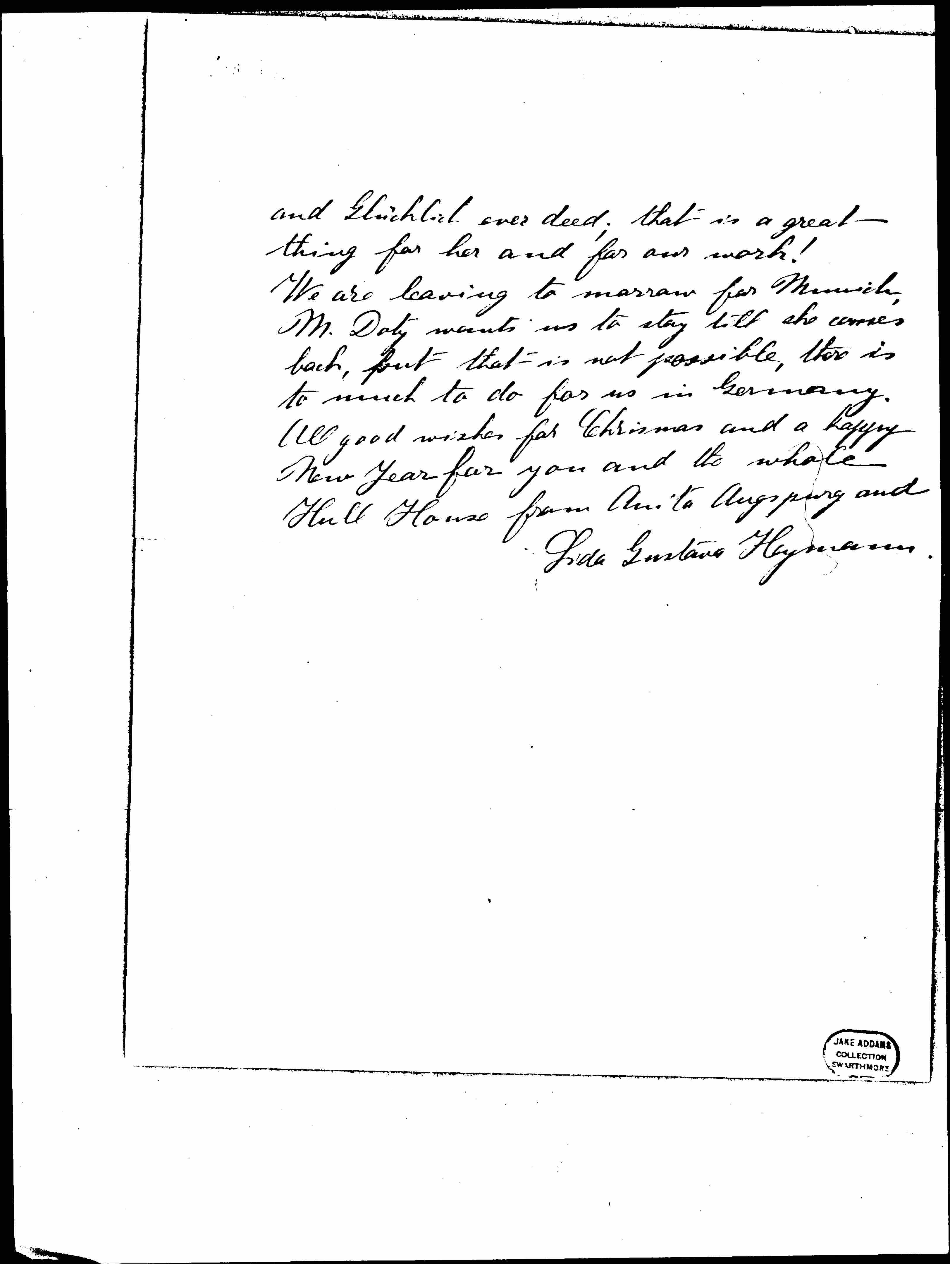We are leaving [tomorrow] for Munich, M. Doty wants us to stay till she comes back, but that is not possible, there is [too] much to do for us in Germany. All good wishes for [Christmas] and a happy New Year for you and the whole Hull House from Anita Augspurg and