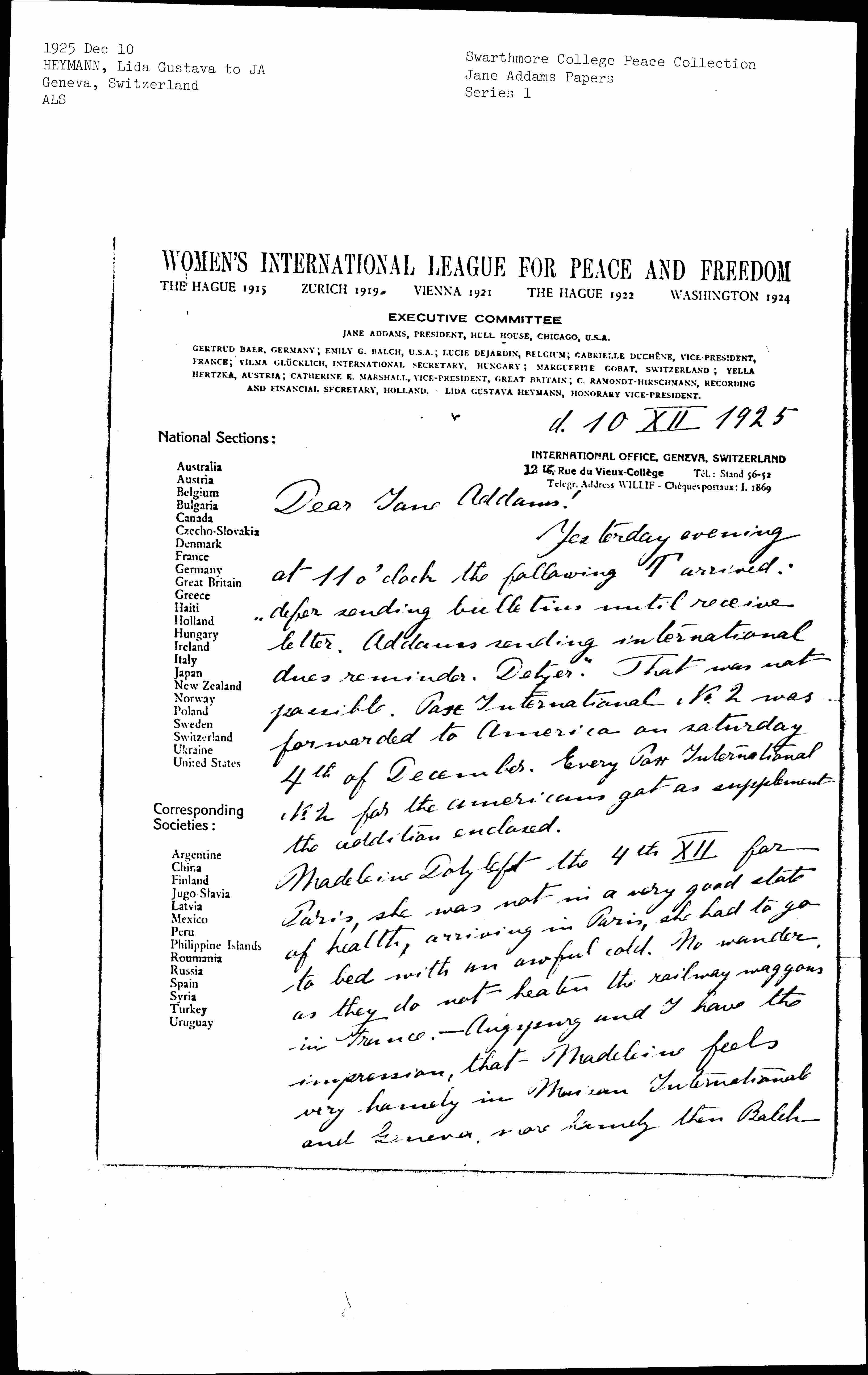 Madeleine Doty left the 4th XII for Paris, she was not in a very good state of health, arriving in Paris, she had to go to bed with an awful cold. No wonder, as they do not [heat] the railway [wagons] in France. -- Augspurg and I have the impression, that Madeleine feels very homely in Maison Internationale and Geneva, more homely than Balch [page 2] and Glücklich ever [did]; that is a great thing for her and for our work!