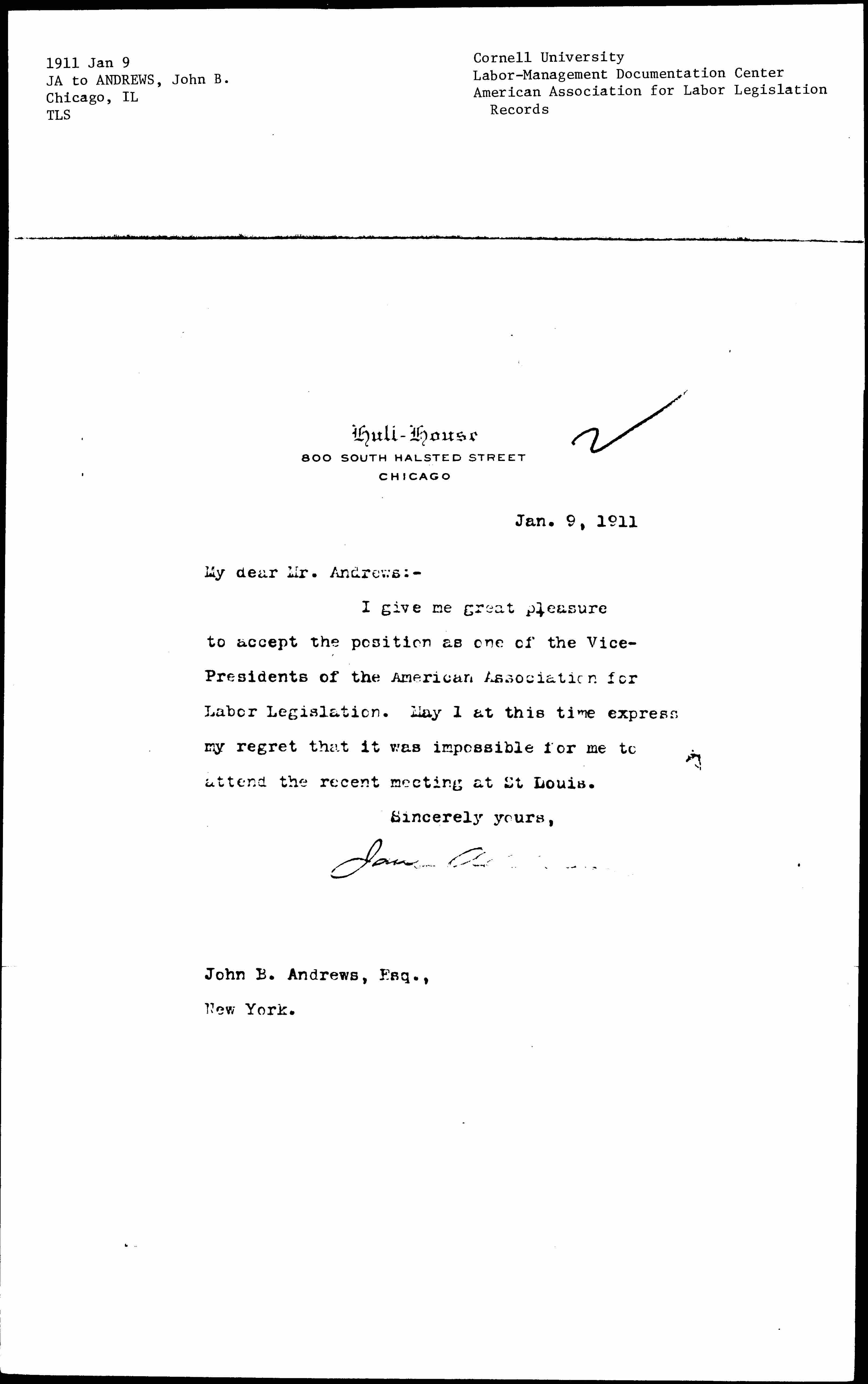 I give me great pleasure to accept the position as one of the Vice-Presidents of the American Association for Labor Legislation. May I at this time express my regret that it was impossible for me to attend the recent meeting at St Louis.