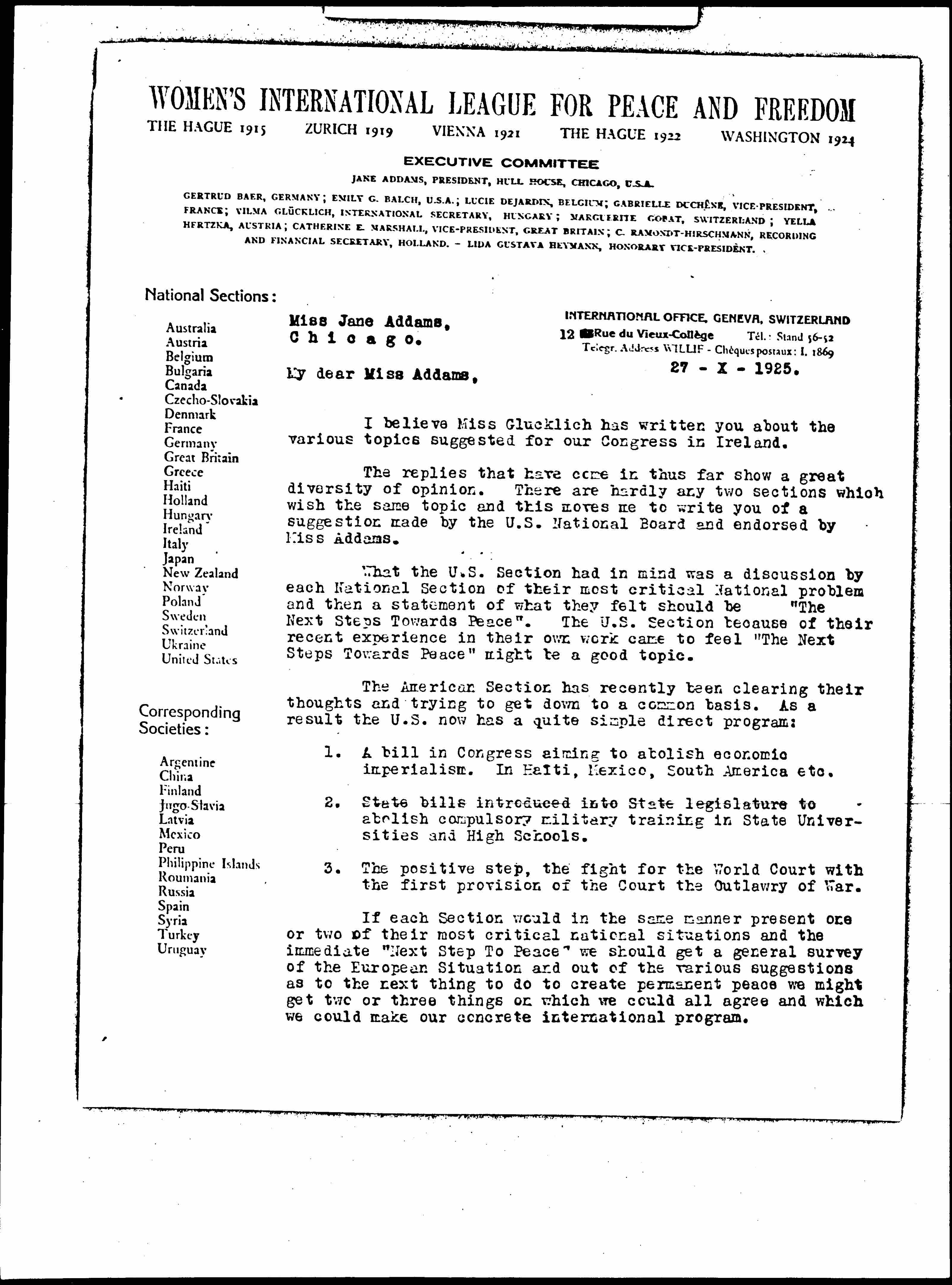 The replies that have come in thus far show a great diversity of opinion. There are hardly any two sections which wish the same topic and this moves me to write you of a suggestion made by the U.S. National Board and endorsed by Miss Addams.
