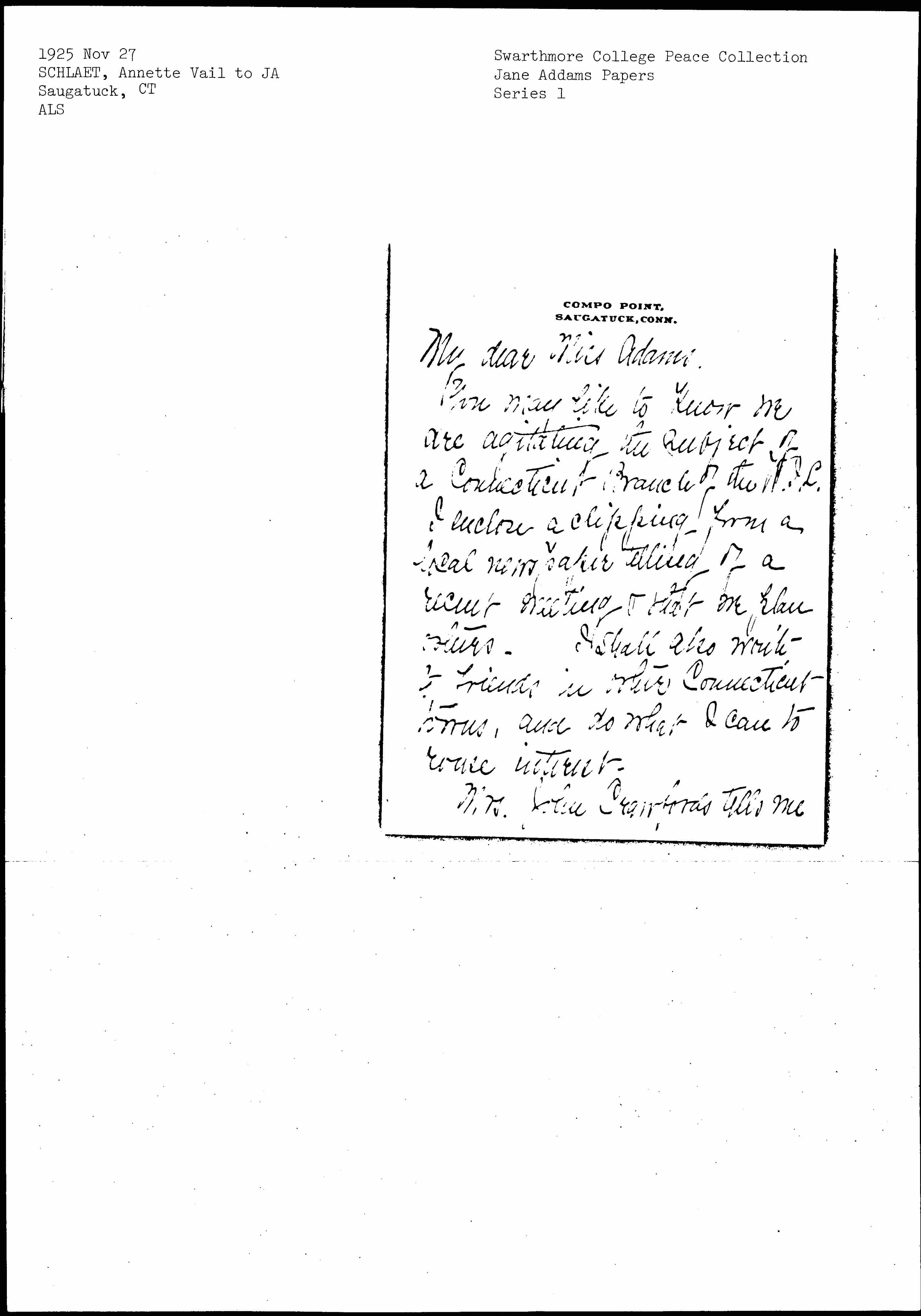 I enclose a clipping from a local newspaper telling of a recent meeting and that we plan others. I shall also write to friends in other Connecticut homes, and do what I can to rouse interest.
