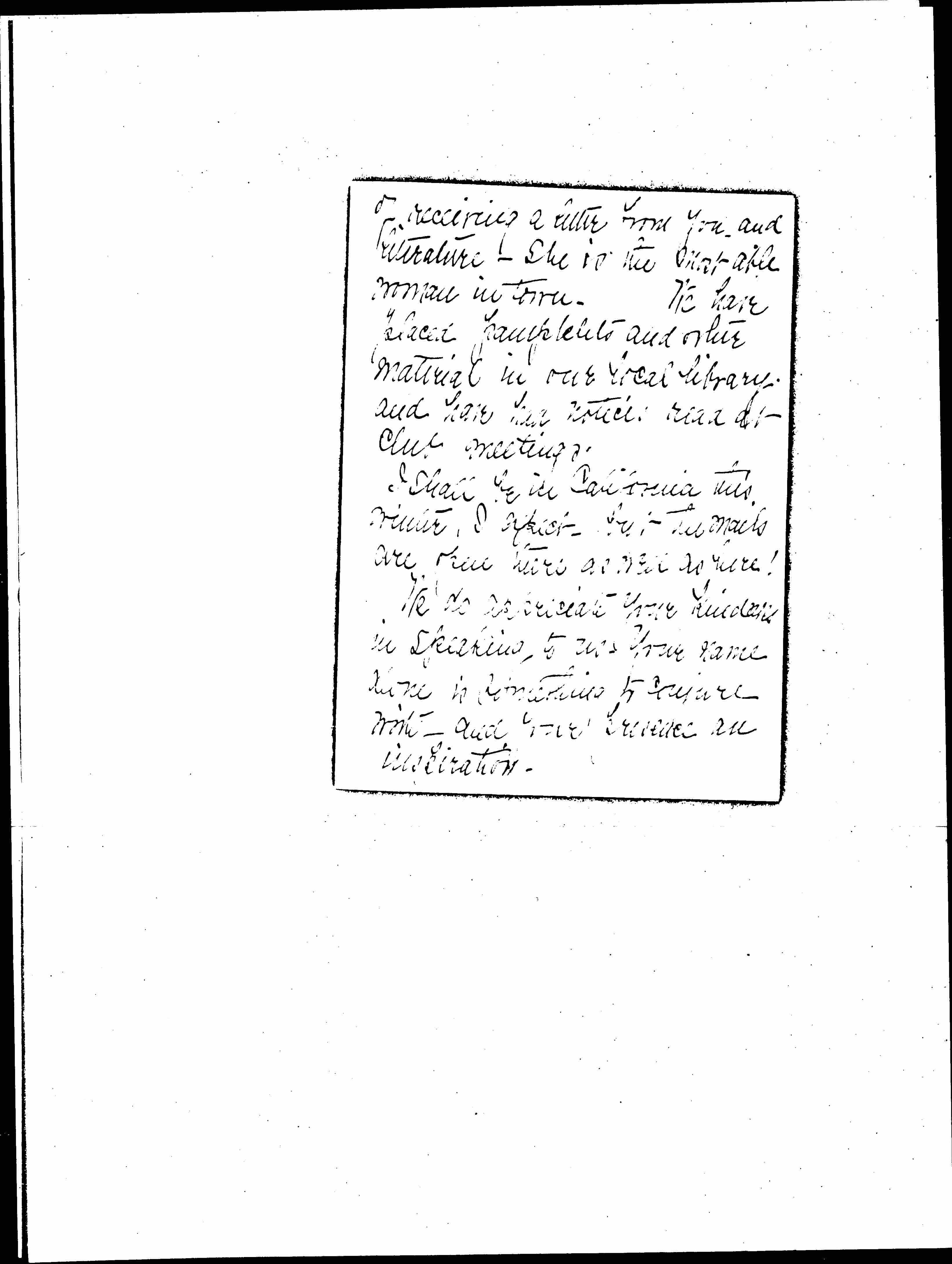 Mrs. John [Crawford] tells me [page 2] of receiving a letter from you and literature. She is the most able woman in there. We have placed pamphlets and other material in our local library and have had notices read at club meetings.