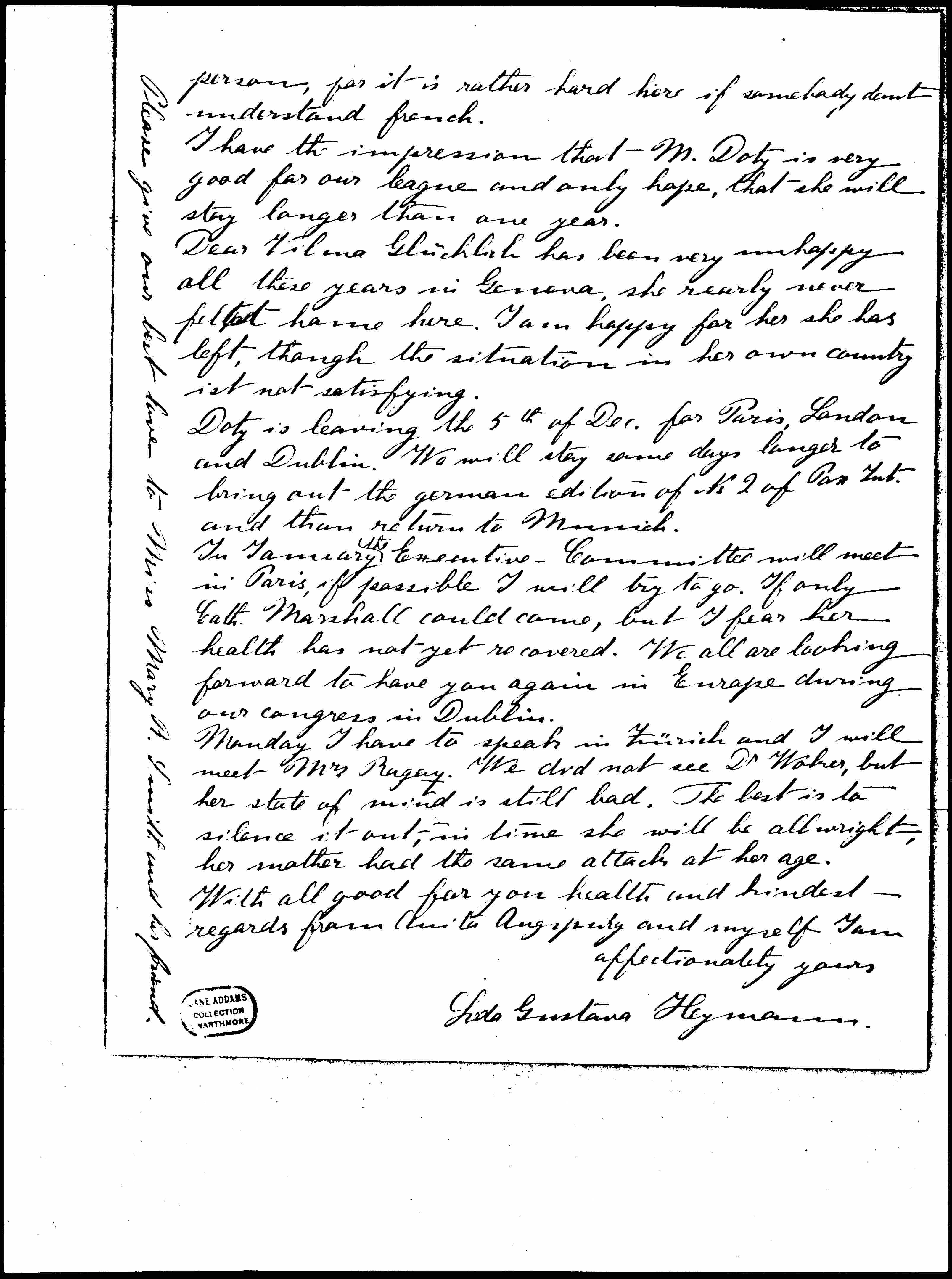 Dr. Augspurg and I are staying in Geneva to help Madeleine Doty. Ten days ago, we learned that you had a bad accident and bruised your ankle. We are very sorry that you have again to suffer so seriously and hope that pains are over when this will reach you and that you are able to do your beloved work in Hull House. Much work is to be done here, but all are in good spirit; we like very much to stay in Maison International. Madeleine Doty has enormously improved in the work of our league, since we saw her in America and she will soon know all details about our European sections and [what] is more important for our league -- European politics.