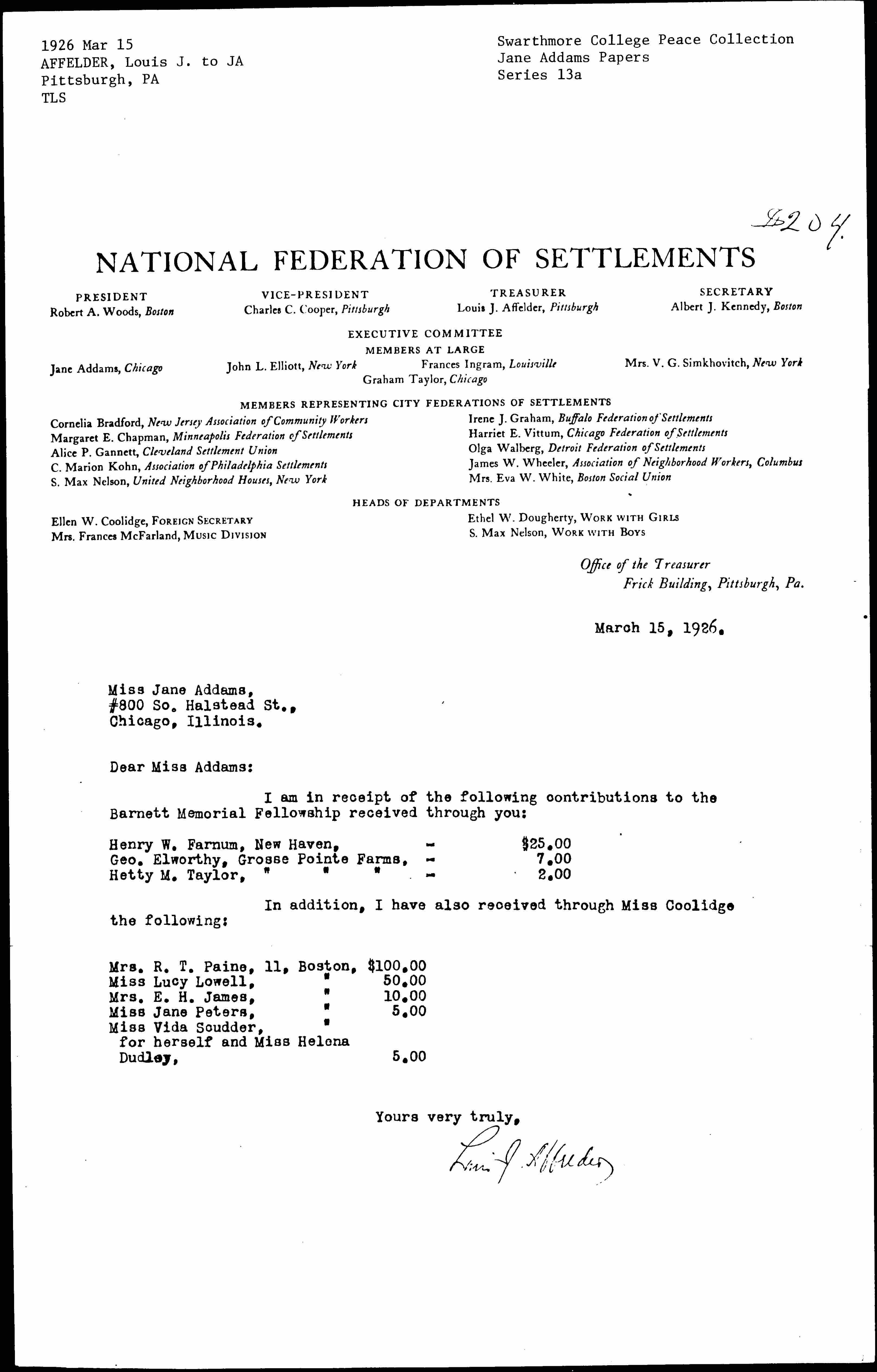 I am in receipt of the following contributions to the Barnett Memorial Fellowship received through you: