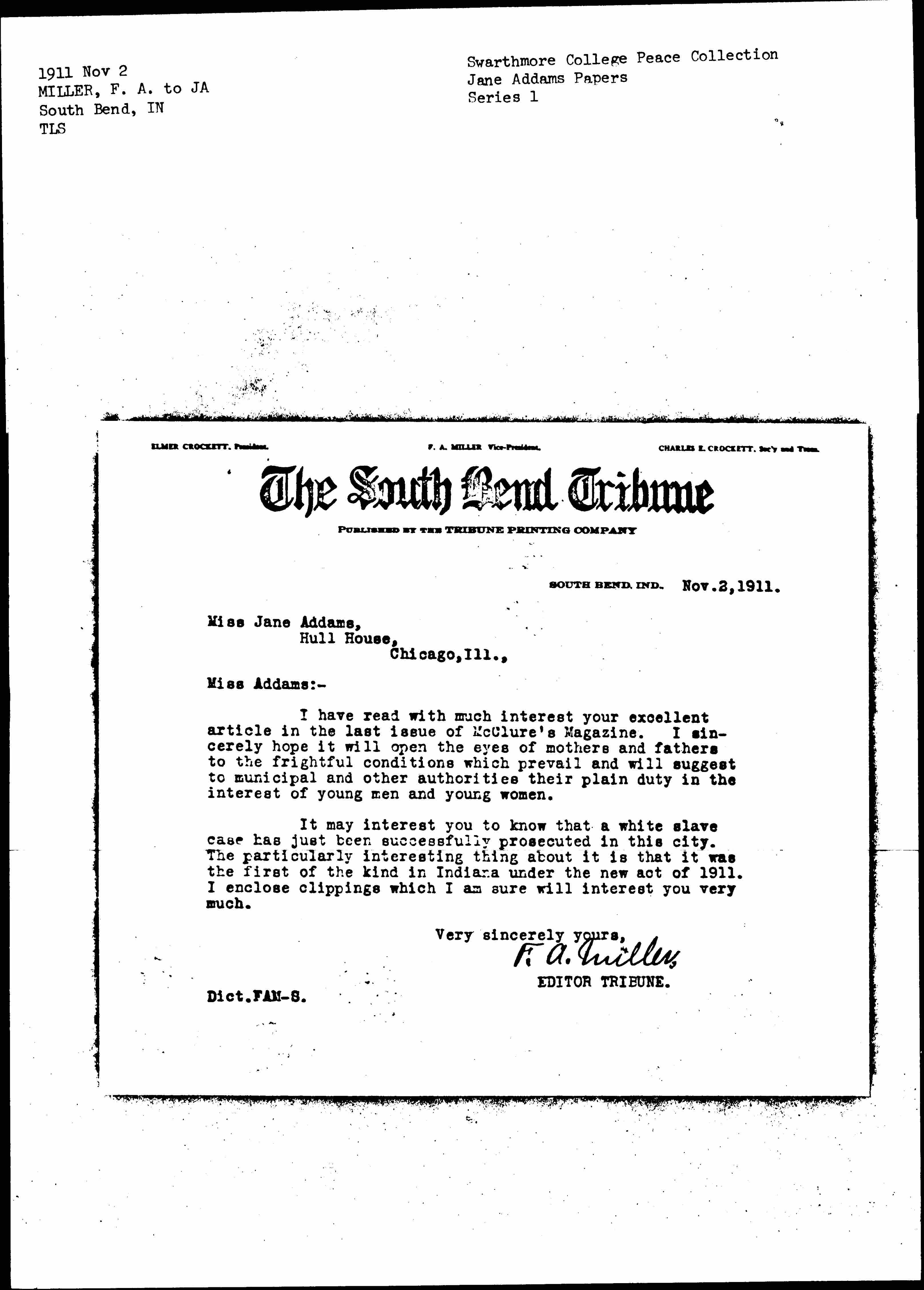 It may interest you to know that a white slave case has just been successfully prosecuted in this city. The particularly interesting thing about it is that it was the first of the kind in Indiana under the new act of 1911. I enclose clippings which I am sure will interest you very much.