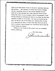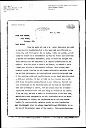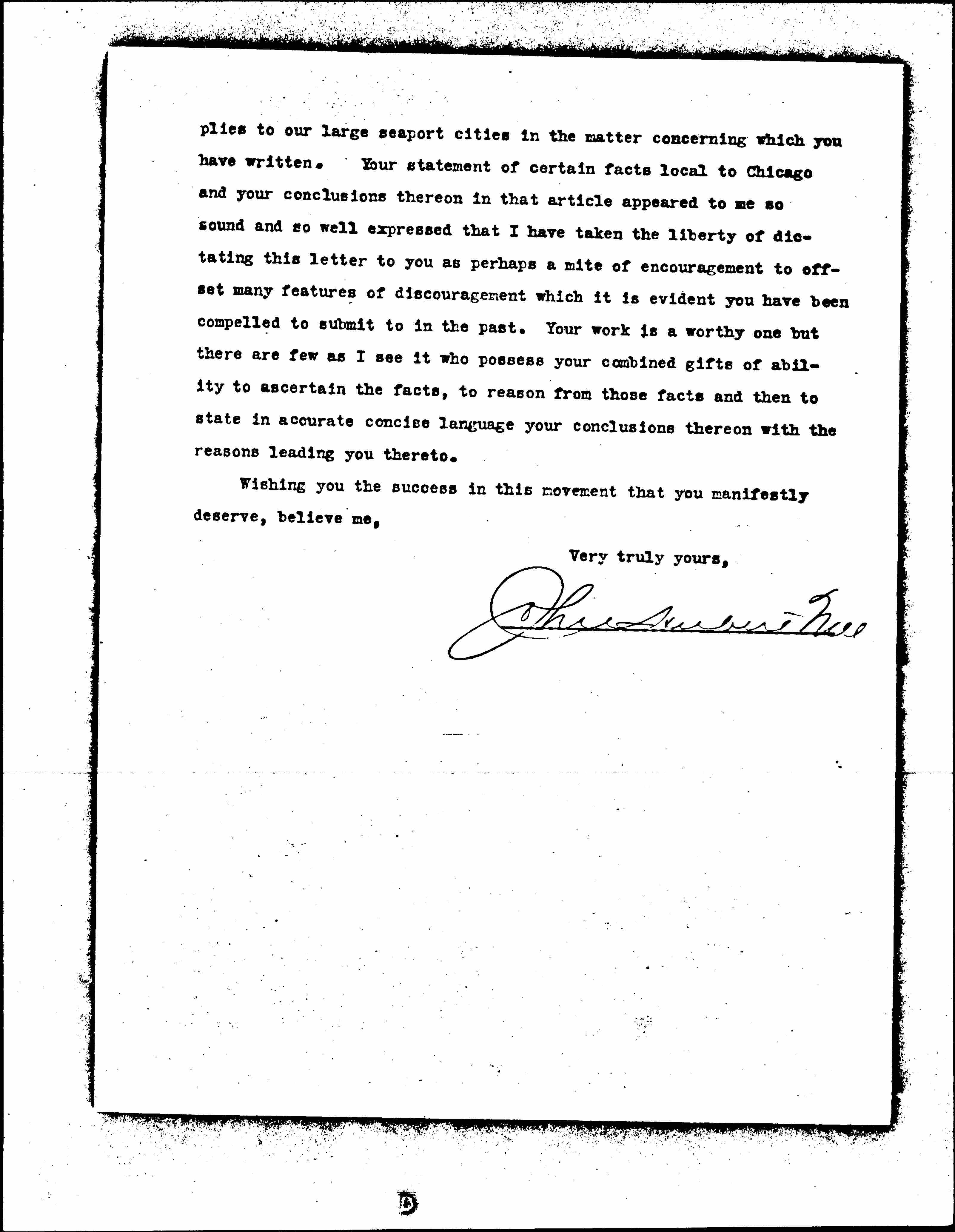 From the point of view of a lawyer interested not only in constructive legislation but in its impartial and efficient enforcement, much that appears in our daily, weekly and monthly periodicals has seemed to me insufficient in that the writer had essentially lacked the necessary experience, grasp of facts and insight into their meaning that was requisite to a complete presentation of the subject. From the point of view of the lawyer, it seemed to me as I read your article in this month's McClures that nothing that I remember coming from the pen of a woman technically untrained in the law and its enforcement, so incisively and correctly portrayed some of the existing evils and insufficiencies in our legal administration as did your article. In that article you have touched upon a subject where the police administration in our cities has favored certain individuals in the non-enforcement of the law and has denied that same privilege to others, with the result that the so-called segregated districts have come into being in certain of our cities. In my own city, we have a number of illustrations of the same idea, particularly with reference to the evil concerning which you wrote, the dispensing of liquor, the regulations as to fire and general health. To constructively legislate wisely and when legislation has been brought about to enforce impartially and effectively is today one of the greatest needs of the country. This particularly [page 2] applies to our large seaport cities in the matter concerning which you have written. Your statement of certain facts local to Chicago and your conclusions thereon in that article appeared to me so sound and so well expressed that I have taken the liberty of dictating this letter to you as perhaps a mite of encouragement to offset many features of discouragement which it is evident you have been compelled to submit to in the past. Your work is a worthy one but there are few as I see it who possess your combined gifts of ability to ascertain the facts, to reason from those facts and then to state in accurate concise language your conclusions thereon with the reasons leading you thereto.
