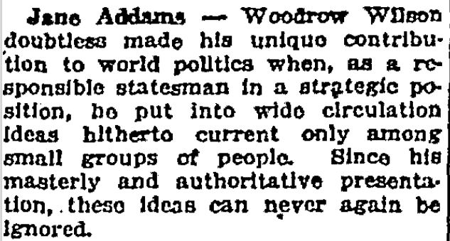 Jane Addams -- Woodrow Wilson doubtless made his unique contribution to world politics when, as a responsible stateman in a strategic position, he put into wide circulation ideas hitherto current only among small groups of people. Since his masterly and authoritative presentation, these ideas can never again be ignored.