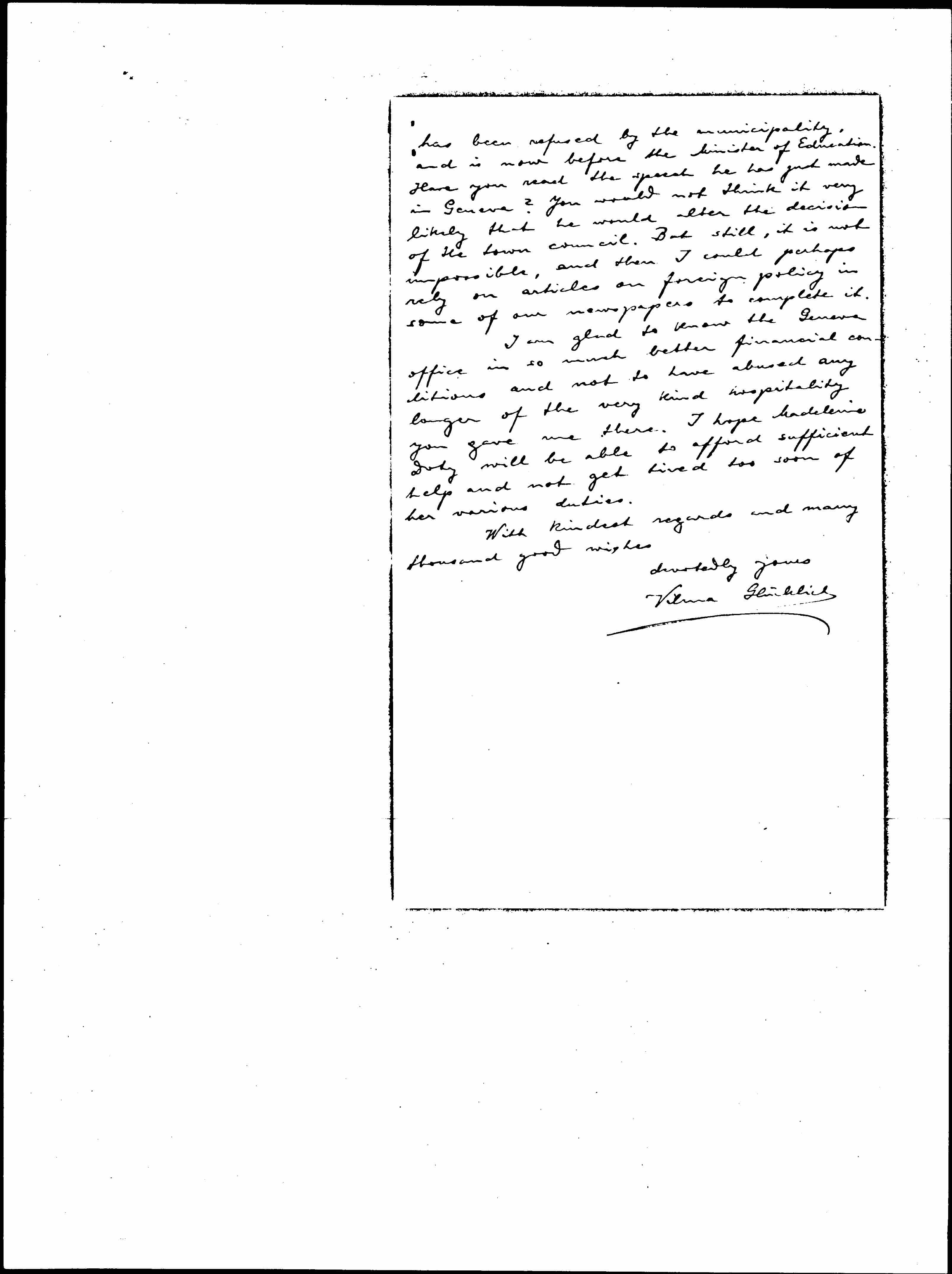 My personal situation is still unsettled; unemployment among intellectuals is so great that I have scruples to accept a job which can be filled in by other people as well. I am trying to get hold of my pension; it [page 2] has been refused by the municipality, and is now before the Minister of Education. Have you read the speech he has just made in Geneva? You would not think it very likely that he would alter the decision of the town council. But still, it is not impossible, and then I could perhaps rely on articles on foreign policy in some of our newspapers to complete it.