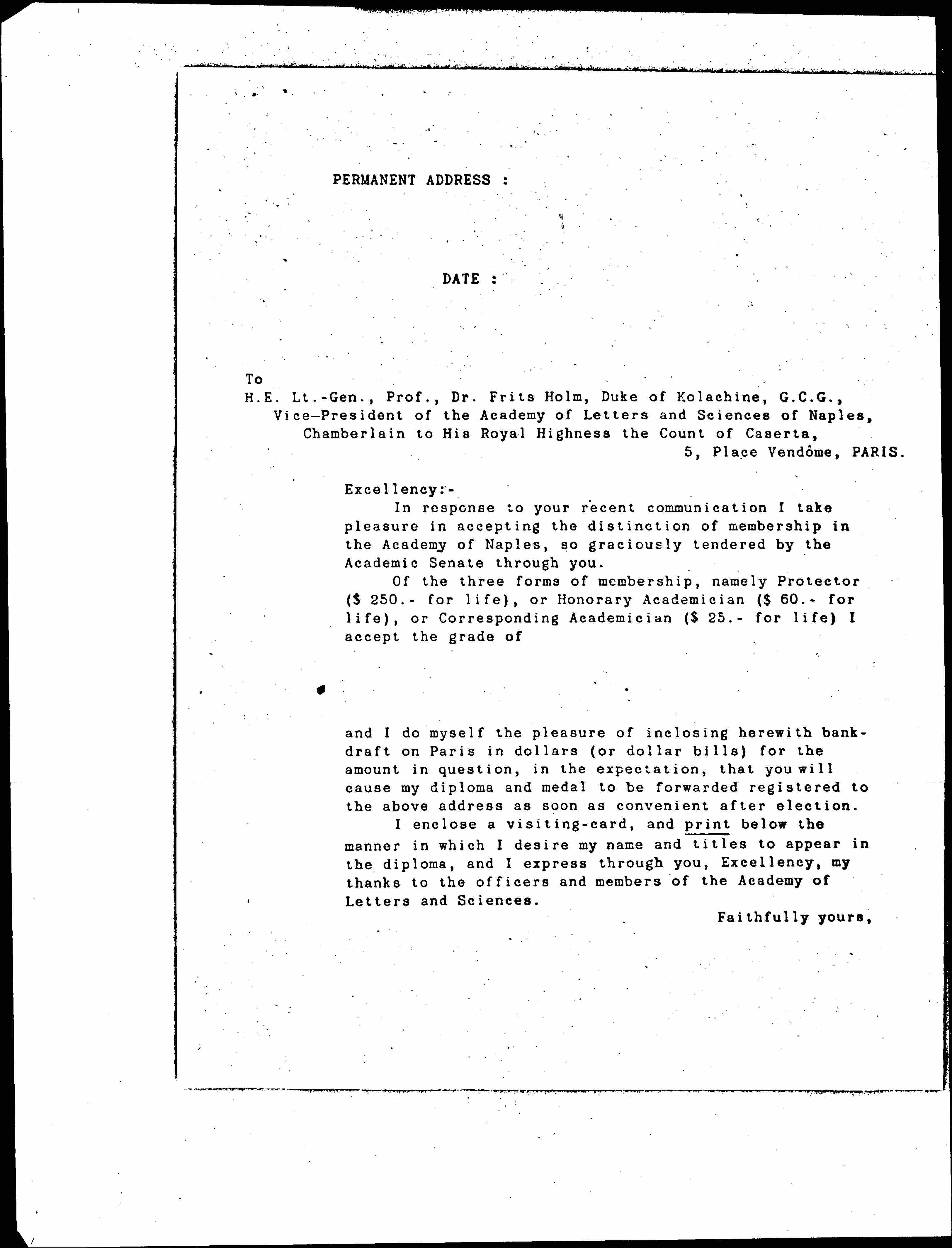 Of the three forms of membership, namely Protector ($250 -- for life), or Honorary Academician ($60 -- for life), or Corresponding Academician ($25. -- for life) I accept the grade of [blank] and I do myself the pleasure of [enclosing] herewith bank-draft on Paris in dollars (or dollar bills) for the amount in question, in the expectation, that you will cause my diploma and medal to be forwarded registered to the above address as soon as convenient after election.