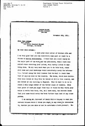 I have your kind letter of October 27th and I am very glad that you can contribute some part at least to a volume on Social Settlements. I wish that you could really do the major part of the work, and the publishers, whom I have consulted since receiving your letter, will hardly listen to anything else. We all very much want you to do this book, since your name and your knowledge would undoubtedly carry the information further among the very classes that we want to reach than that of anybody else in the country. The books, which have heretofore been issued at 75 [cents] will be issued at 50 [cents] in this country, and are issued at one shilling in England. What we want to do it to reach a very large number of the better class of readers. From that point of view you might find that it would be well worth your while to write this book; for, as I have said, the editors think that your name would carry the book further than that of any other person.