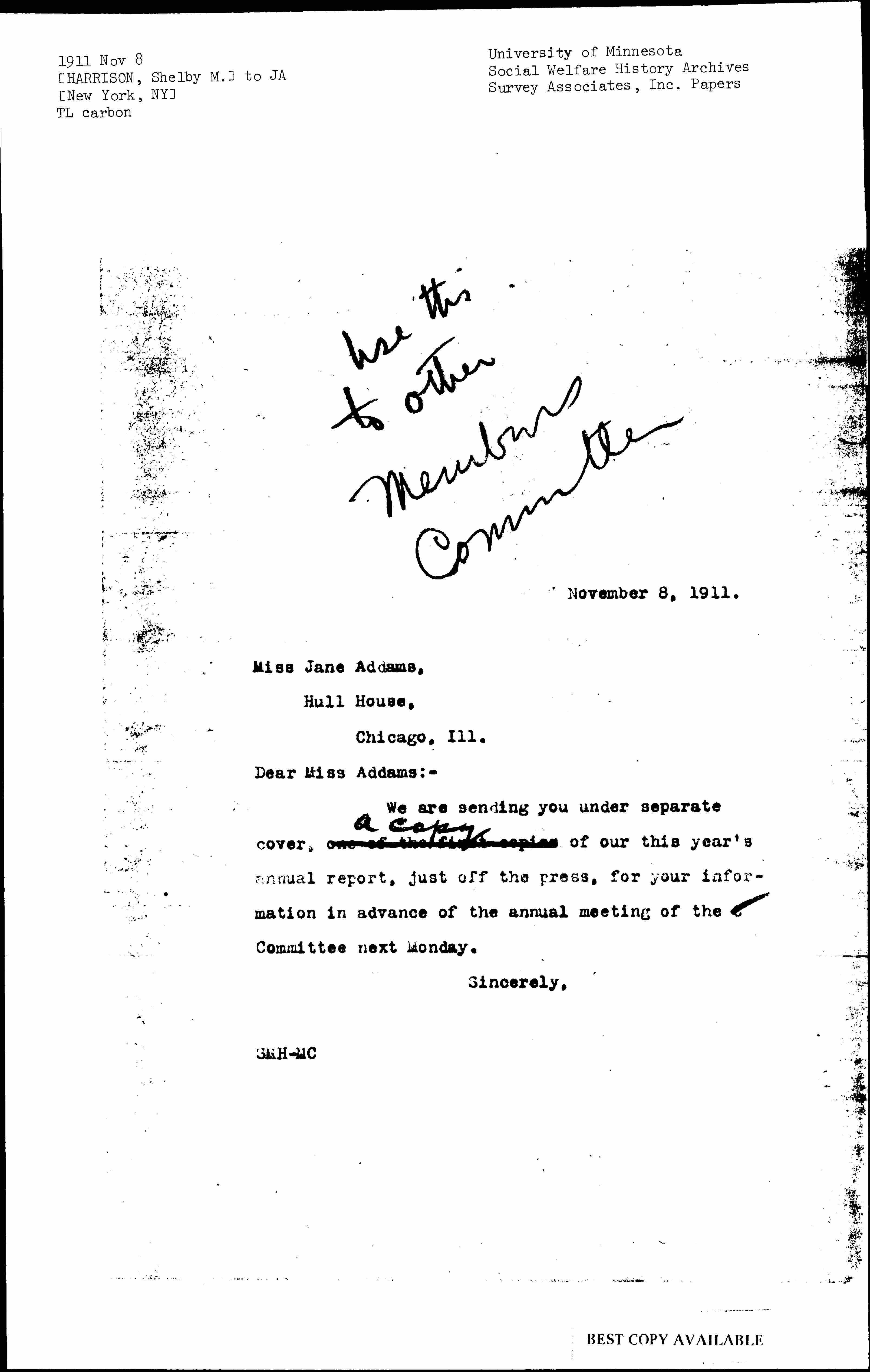 We are sending you under separate cover, one of the first copies <a copy> of our this year's annual report, just off the press, for your information in advance of the annual meeting of the Committee next Monday.