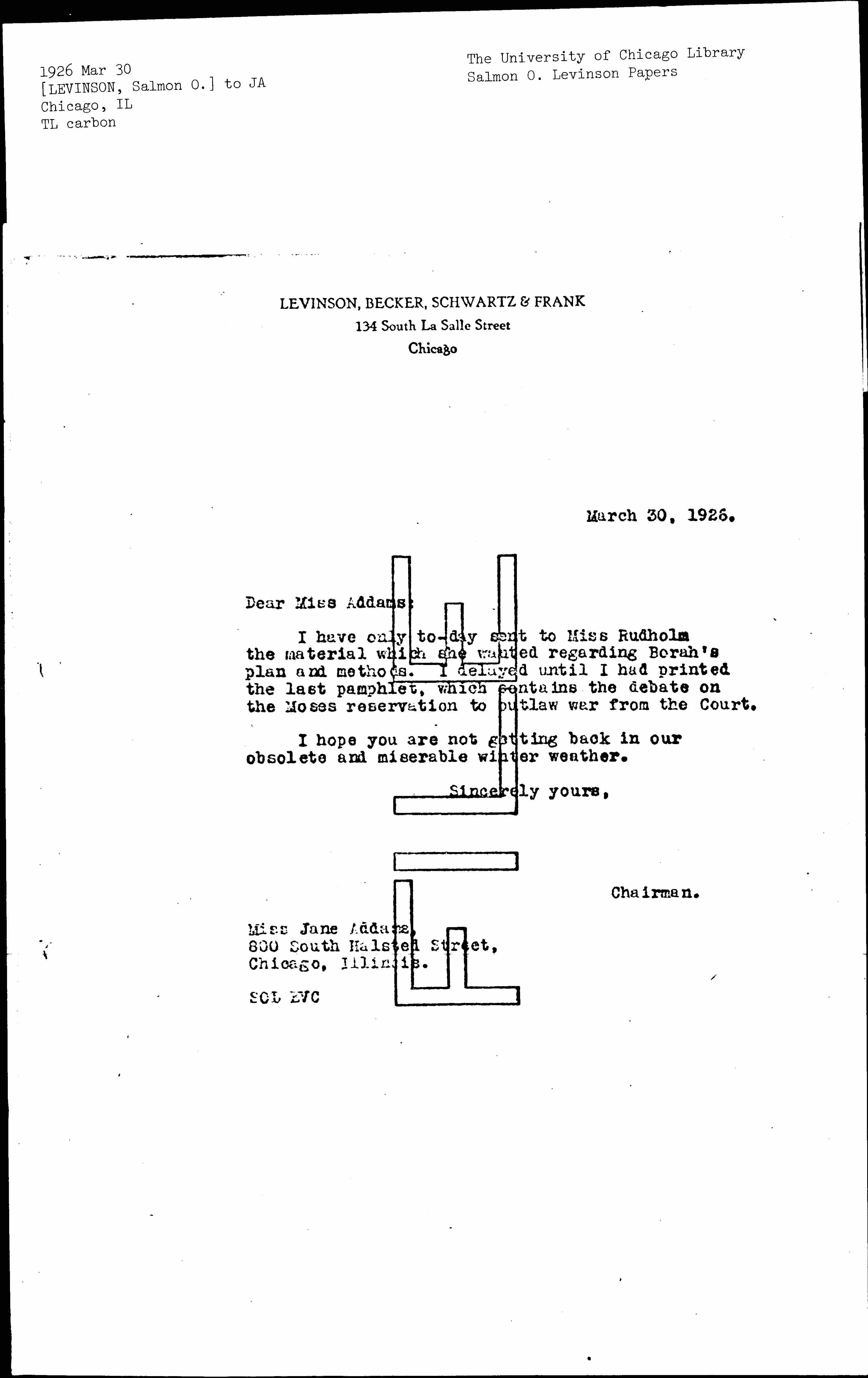 I have only [today] sent to Miss Rudholm the material which she wanted regarding Borah's plan and methods. I delayed until I had printed the last pamphlet, which contains the debate on the Moses reservation to outlaw war from the Court.