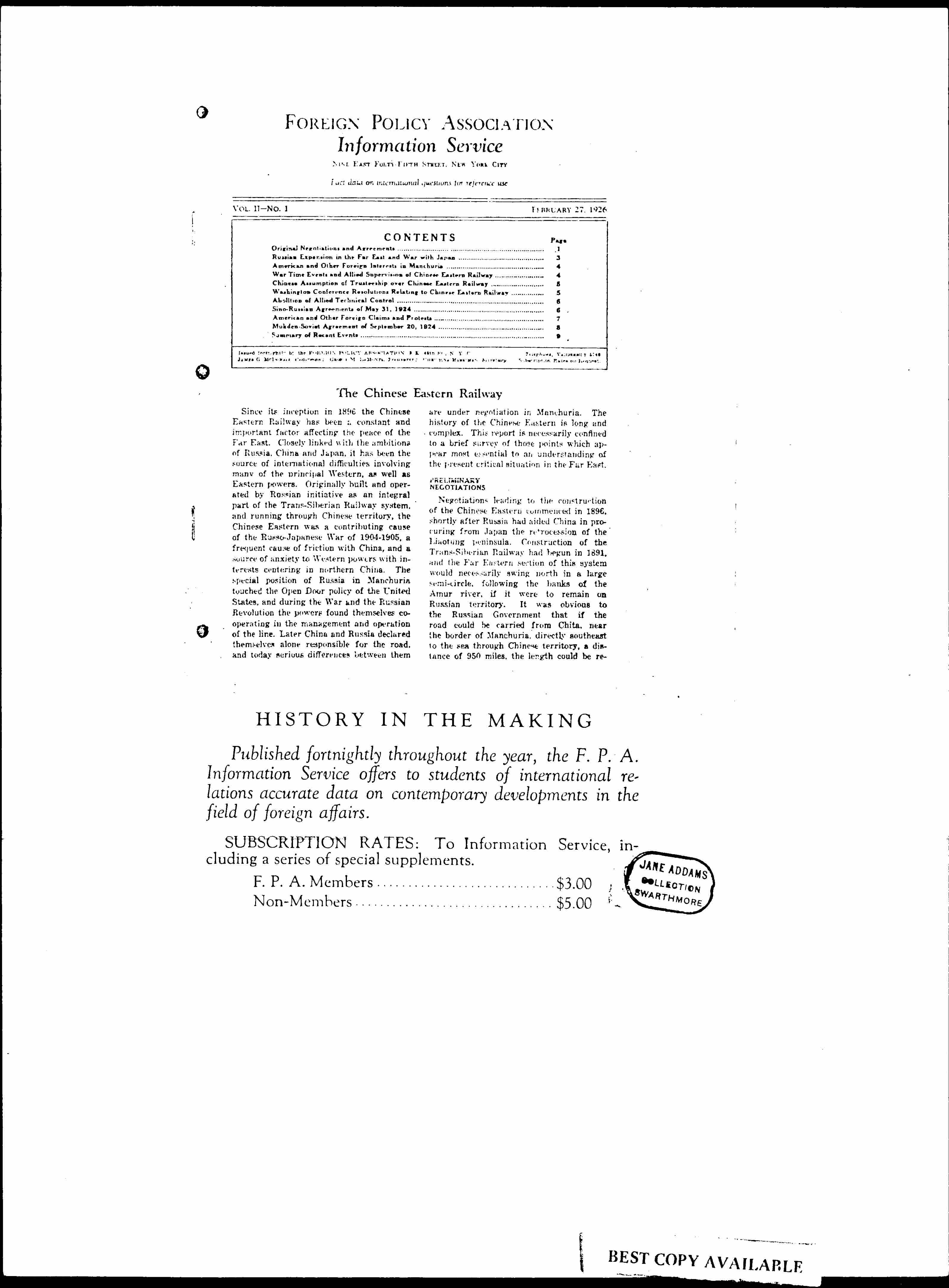 Since its inception in 1896 the Chinese Eastern Railway has been a constant and important factor affecting the peace of the Far East. Closely linked with the ambitions of Russia, China and Japan, it has been the source of international difficulties involving many of the principal Western, as well as Eastern powers. Originally built and operated by Russian initiative as an integral part of the Trans-Siberian Railway system, and running through Chinese territory, the Chinese Eastern was a contributing cause of the Russo-Japanese War of 1904-1905, a frequent cause of friction with China, and a source of anxiety to Western powers with interests centering in northern China. The special position of Russia in Manchuria touched the Open Door policy of the United States, and during the War and the Russian Revolution the powers found themselves cooperating in the management and operation of the line. Later China and Russia declared themselves alone responsible for the road, and today serious differences between them are under negotiation in Manchuria. The history of the Chinese Eastern is long and complex. This report is necessarily confined to a brief survey of those points which appear most essential to an understanding of the present critical situation in the Far East.