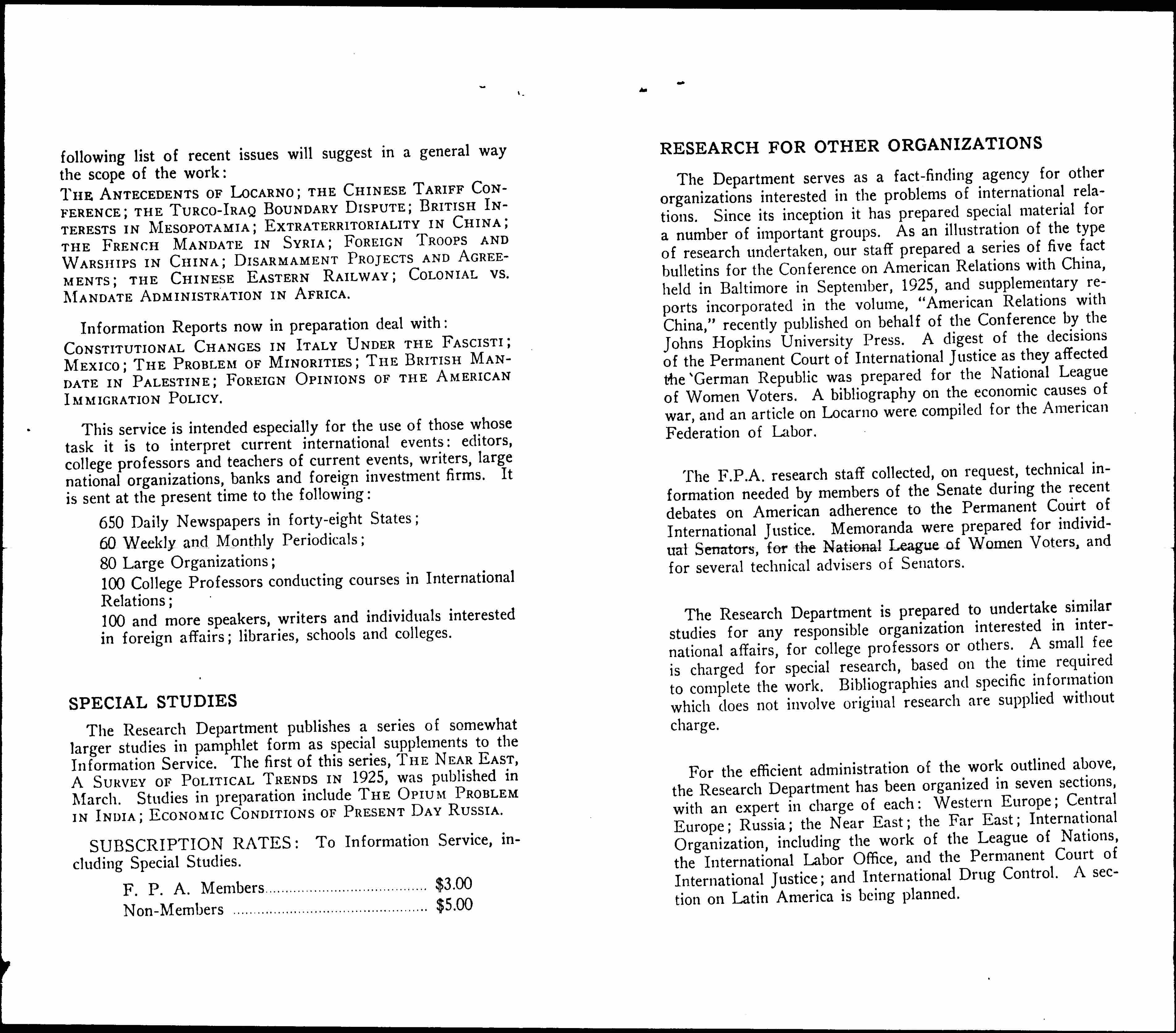 The Research Department is prepared to undertake similar studies for any responsible organization interested in international affairs, for college professors or others. A small fee is charged for special research, based on the time required to complete the work. Bibliographies and specific information which does not involve original research are supplied without charge.