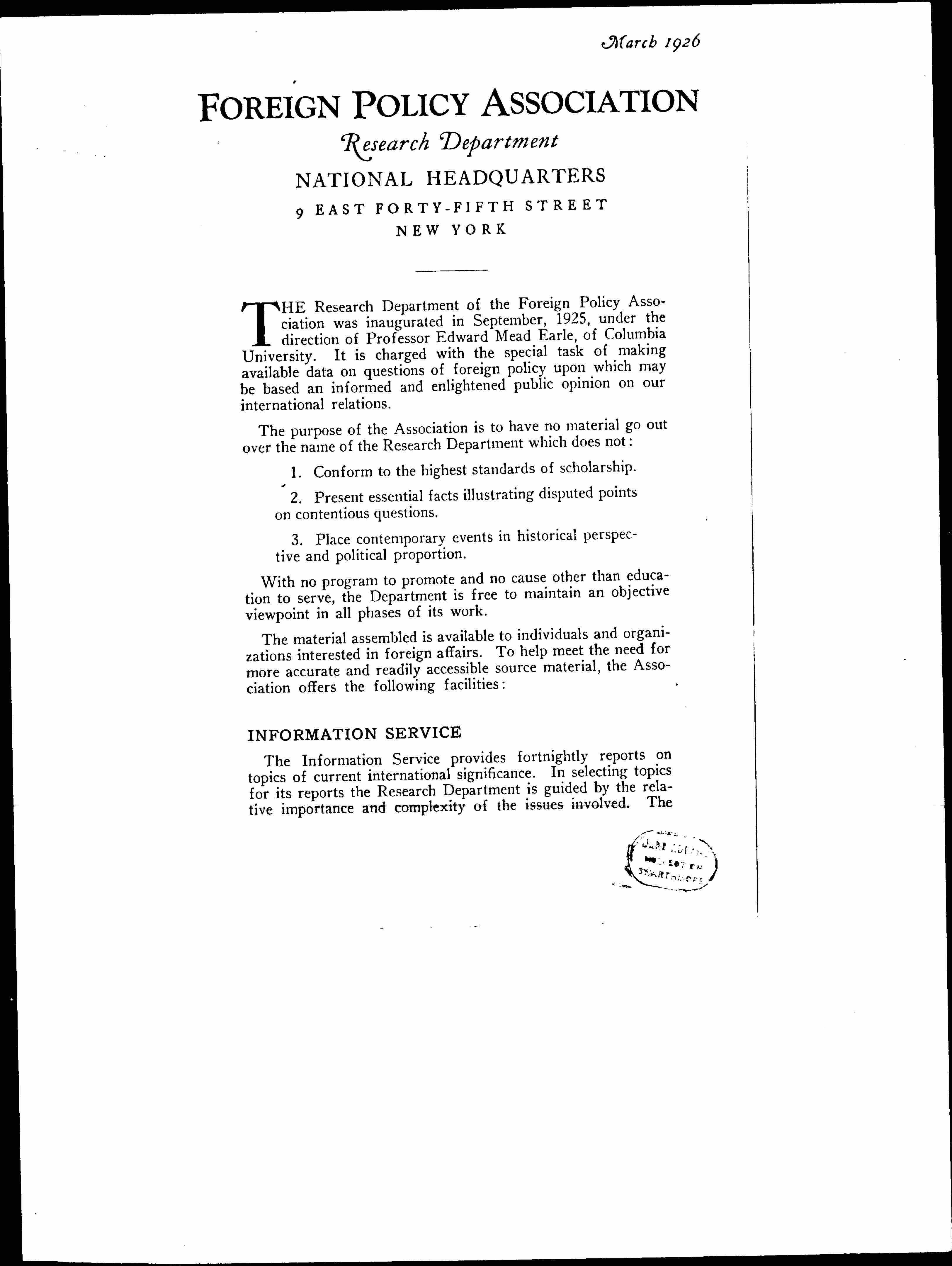 THE Research Department of the Foreign Policy Association was inaugurated in September, 1925, under the direction of Professor Edward Mead Earle, of Columbia University. It is charged with the special task of making available data on questions of foreign policy upon which may be based an informed and enlightened public opinion on our international relations.