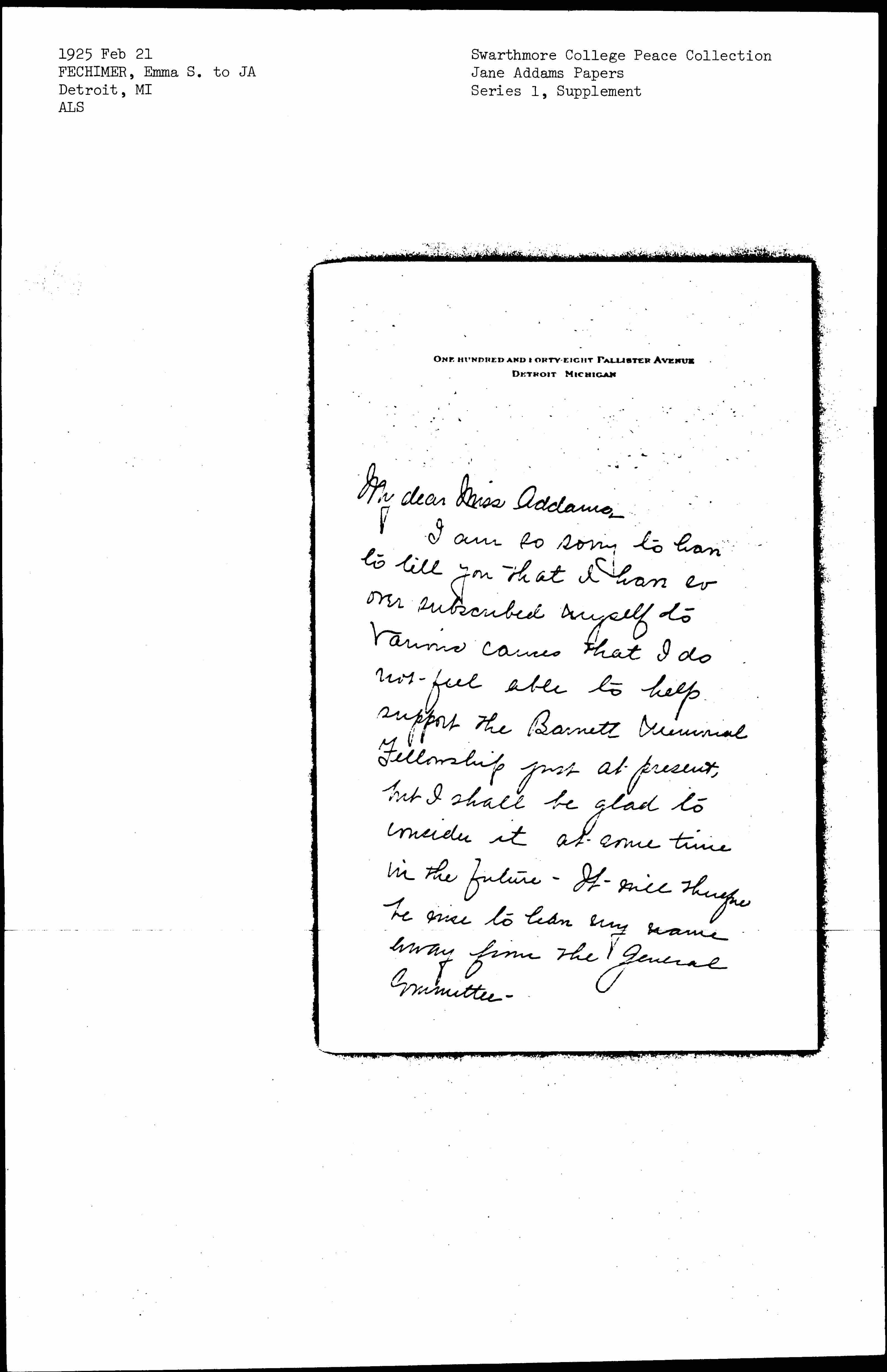 I am so sorry to have to tell you that I have so over subscribed myself to various causes that I do not feel able to help support the Barnett Memorial Fellowship just at present, but I shall be glad to consider it at some time in the future. It will therefore be wise to leave my name away from the General Committee. [page 2]