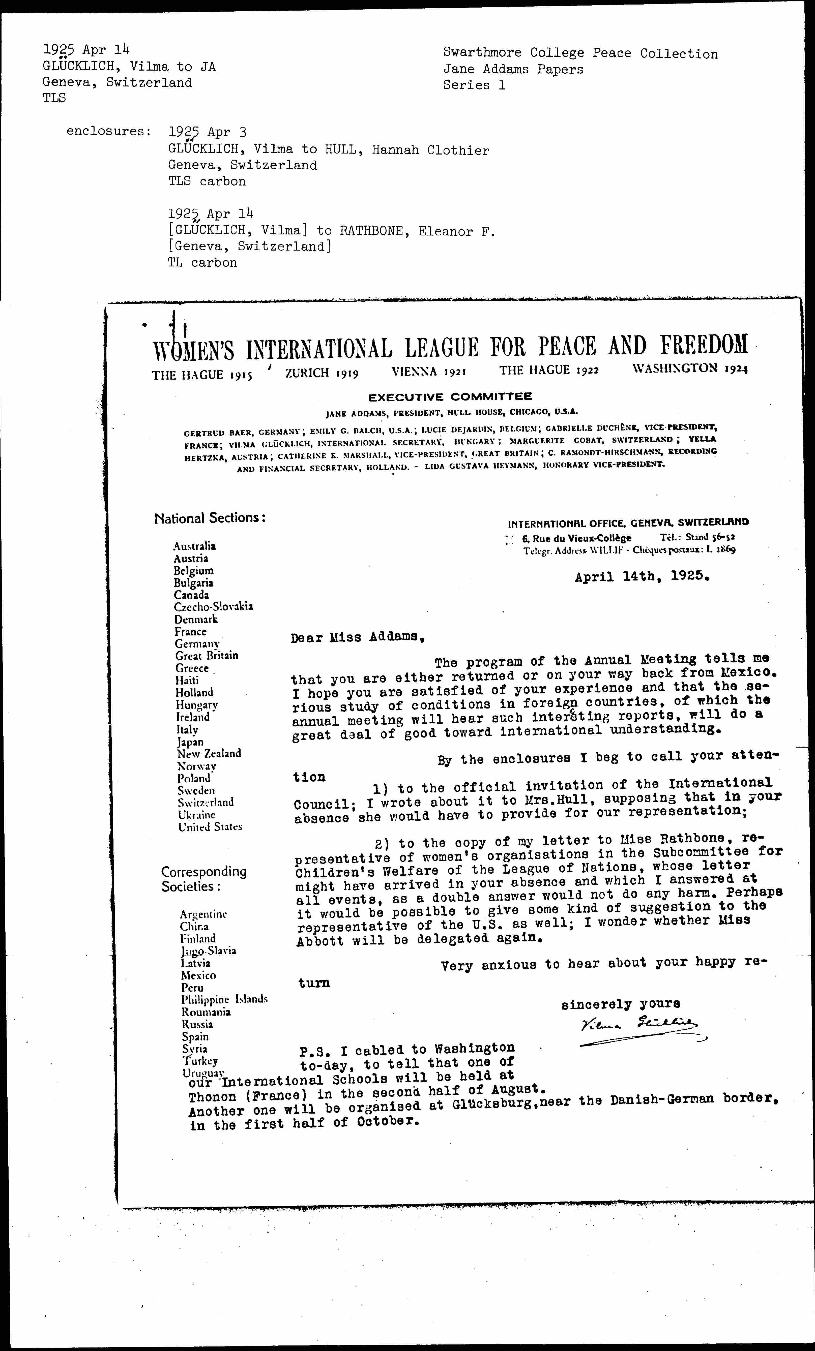 2) to the copy of my letter to Miss Rathbone, representative of women’s [organizations] in the Subcommittee for Children's Welfare of the League of nations, whose letter might have arrived in your absence and which I answered at all events, as a double answer would not do any harm. Perhaps it would be possible to give some kind of suggestion to the representative of the U.S as well; I wonder whether Miss Abbott will be delegated again.