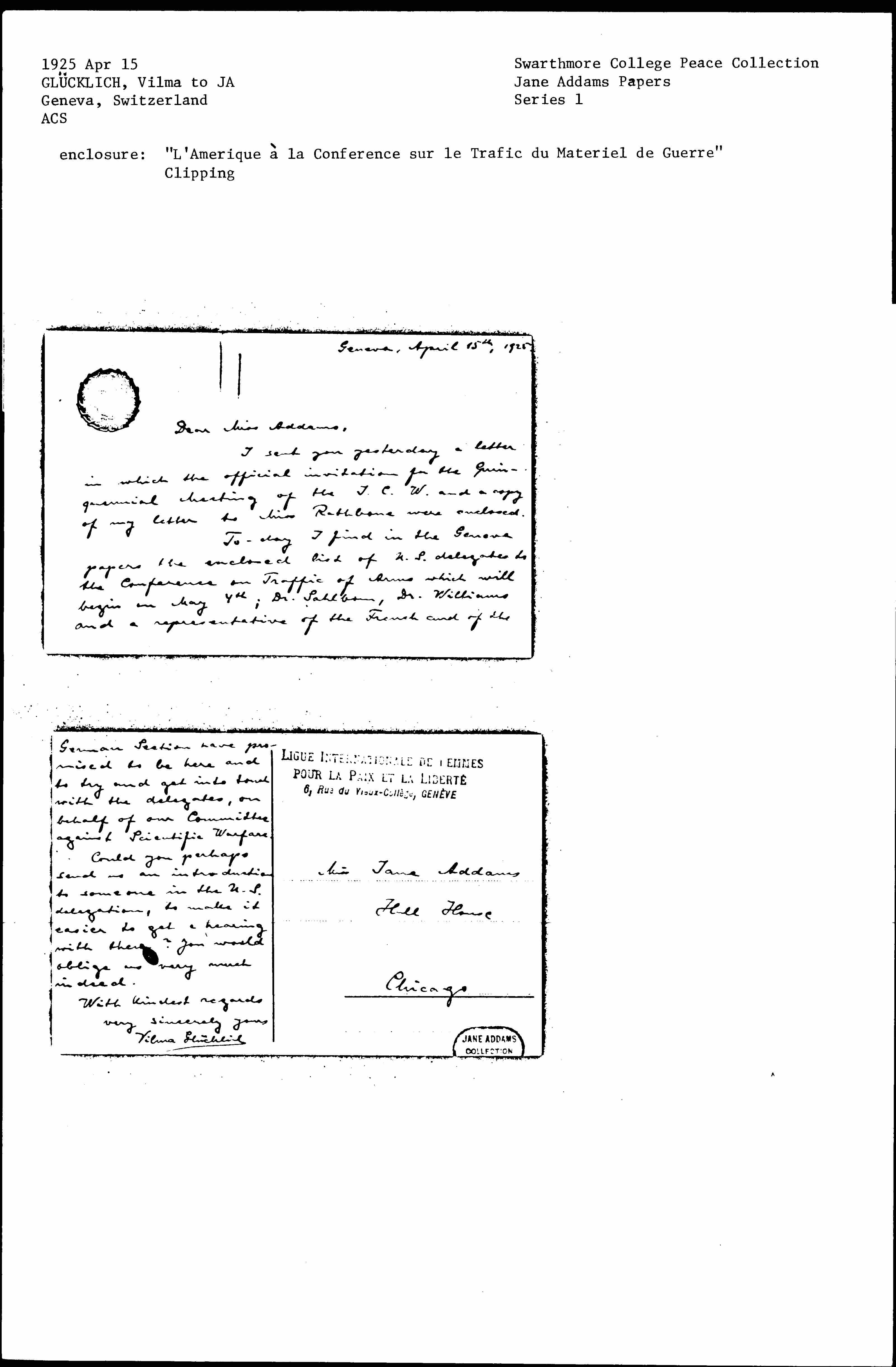 [Today] I find in the Geneva papers the enclosed list of U.S delegates to the Conference on Traffic of Arms which will begin on May 4th; Dr. Sahlbom, Dr. Williams and a representative of the French and of the [page 2] German Section have promised to be here and to try and get into touch with the delegates, on behalf of our Committee against Scientific Warfare.