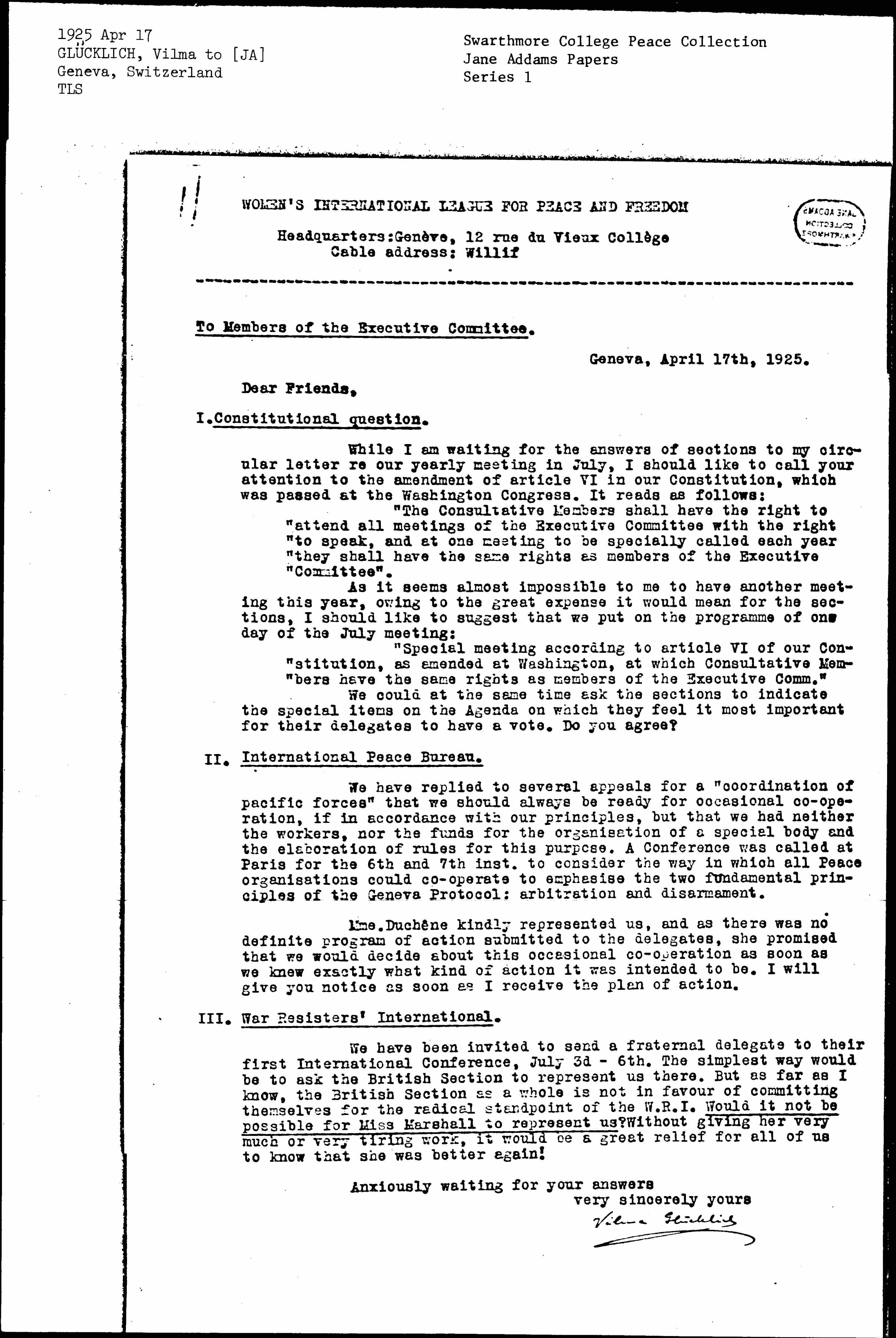 We have been invited to send a fraternal delegate to their first International Conference, July 3rd-6th. The simplest way would be to ask the British Section to represent us there. But as far as I know, the British Section as a whole is not in [favor] of committing themselves for the radical standpoint of the W.R.I. Would it not be possible for Miss Marshall to represent us? Without giving her very much or very tiring work, it would be a great relief for all of us to know that she was better again!