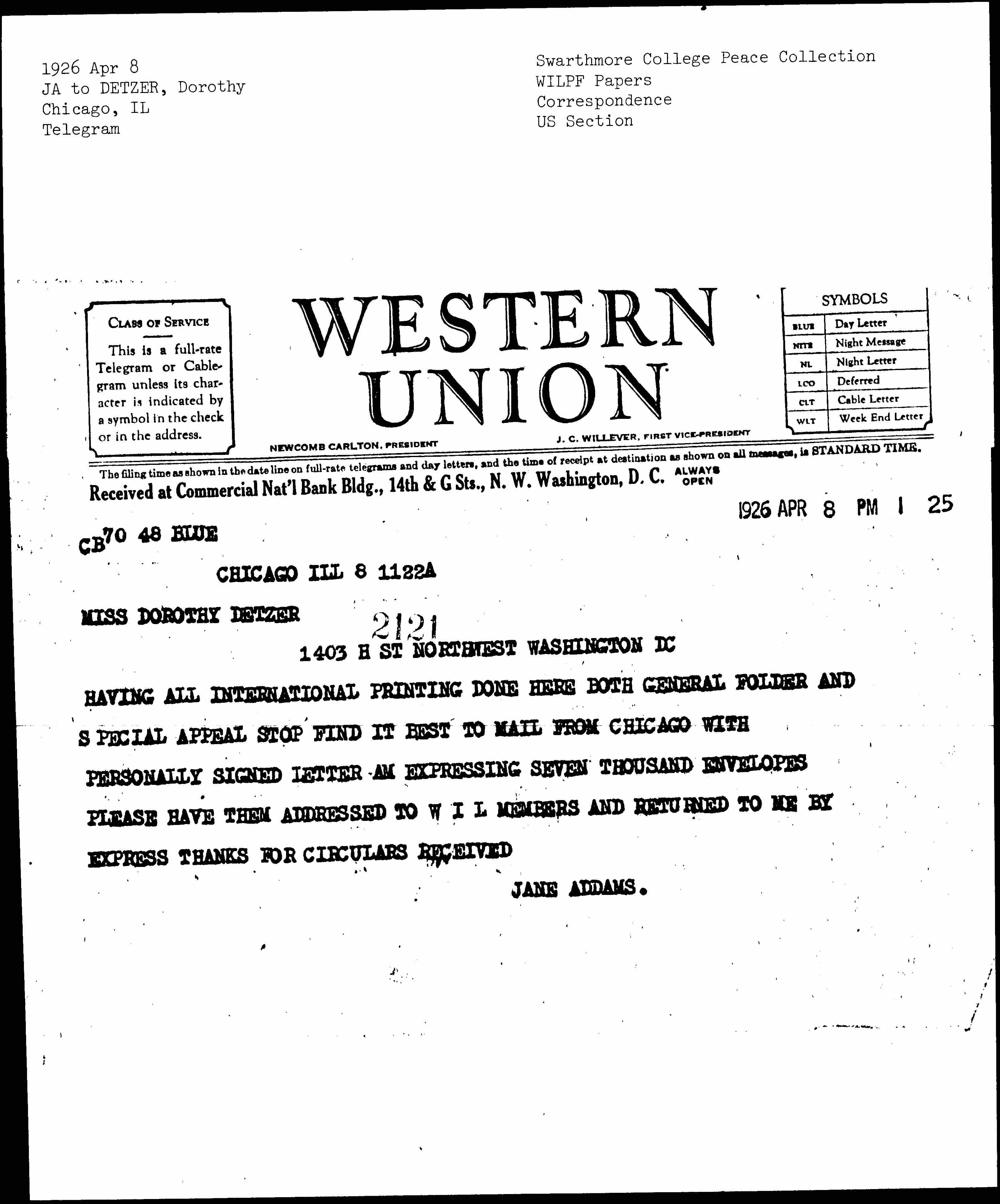 HAVING ALL INTERNATIONAL PRINTING DONE HERE BOTH GENERAL FOLDER AND SPECIAL APPEAL STOP FIND IT BEST TO MAIL FROM CHICAGO WITH PERSONALLY SIGNED LETTER AM EXPRESSING SEVEN THOUSAND ENVELOPES PLEASE HAVE THEM ADDRESSED TO WIL MEMBERS AND RETURNED TO ME BY EXPRESS THANKS FOR CIRCULARS RECEIVED