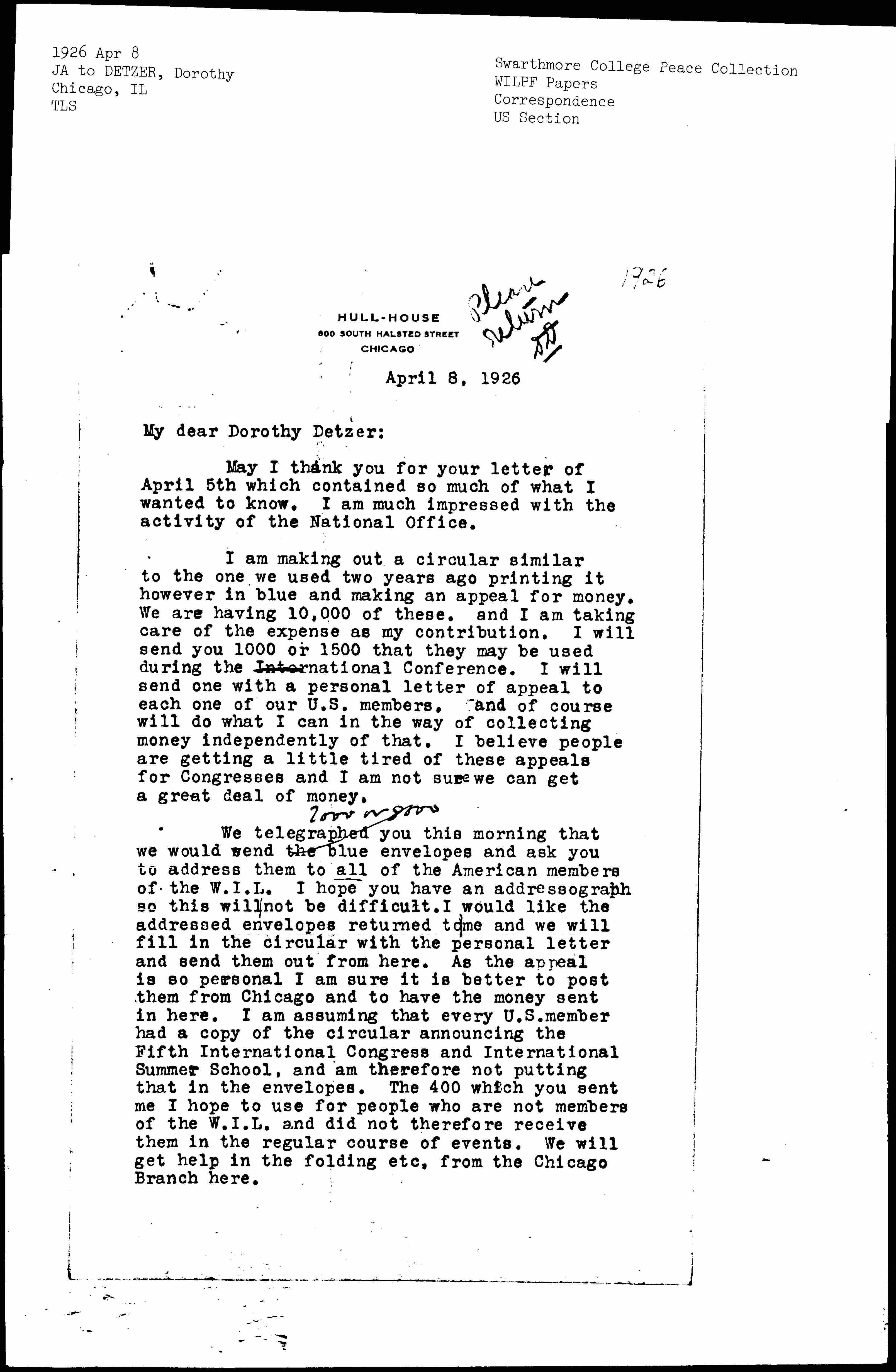 We telegraphed you this morning that we would send ↑7000 or 8000↓ the blue envelopes and ask you to address them to all of the American members of the W.I.L. I hope you have an addressograph so this will not be difficult. I would like the addressed envelopes returned to me and we will fill in the circular with the personal letter and send them out from here. As the appeal is so personal I am sure to is better to post them from Chicago and to have the money sent in here. I am assuming that every U.S. member had a copy of the circular announcing the Fifth International Congress and International Summer School, and am therefore not putting that in the envelopes. The 400 which you sent me I hope to use for people who are not members of the W.I.L. and did not therefore receive them in the regular course of events. We will get help in the folding etc, from the Chicago Branch here. [page 2]