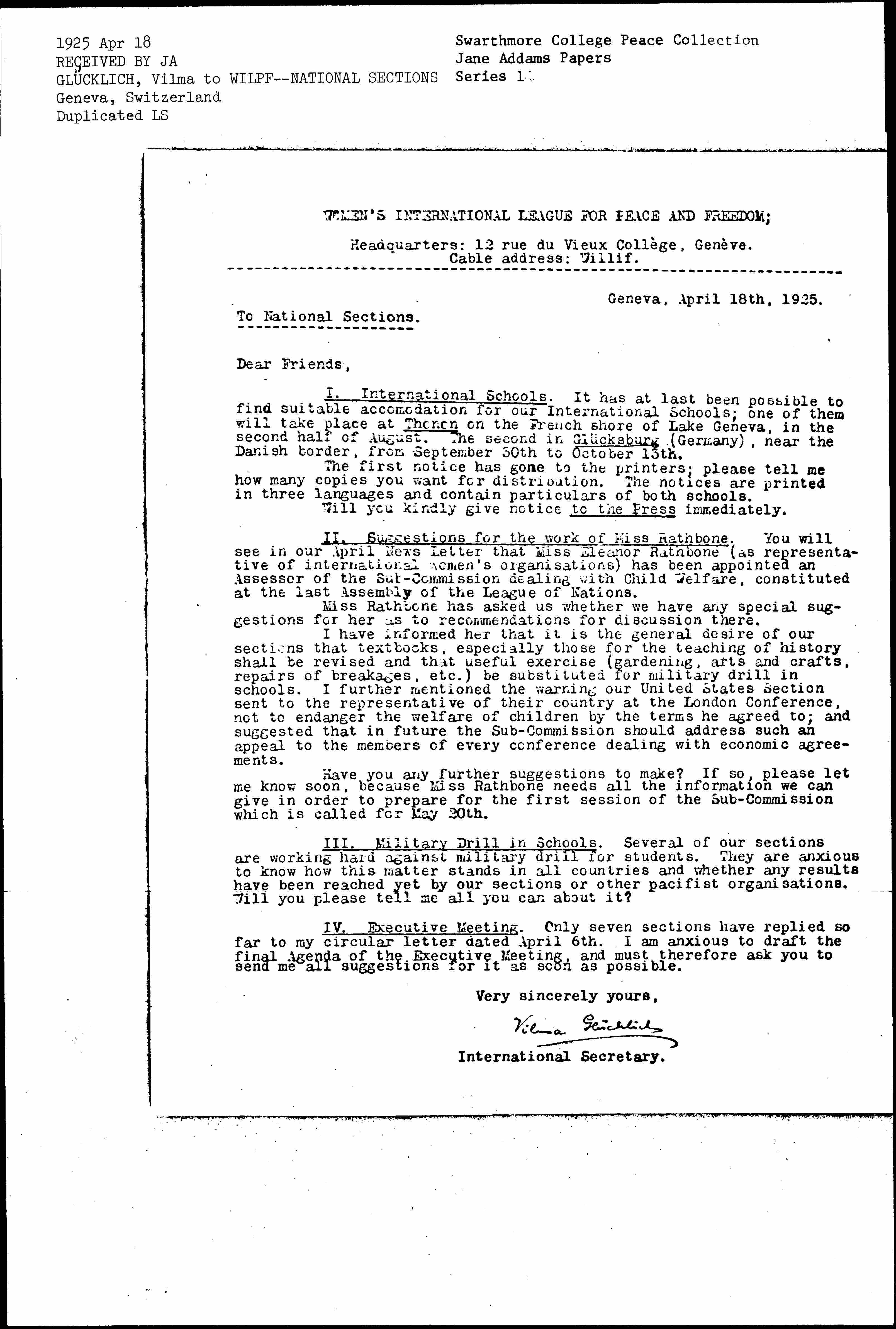 III. Military Drill in Schools. Several of our sections are working hard against military drill for students. They are anxious to know how this matter stands in all countries and whether any results have been reached yet by our sections or other pacifist [organizations]. Will you please tell me all you can about it?