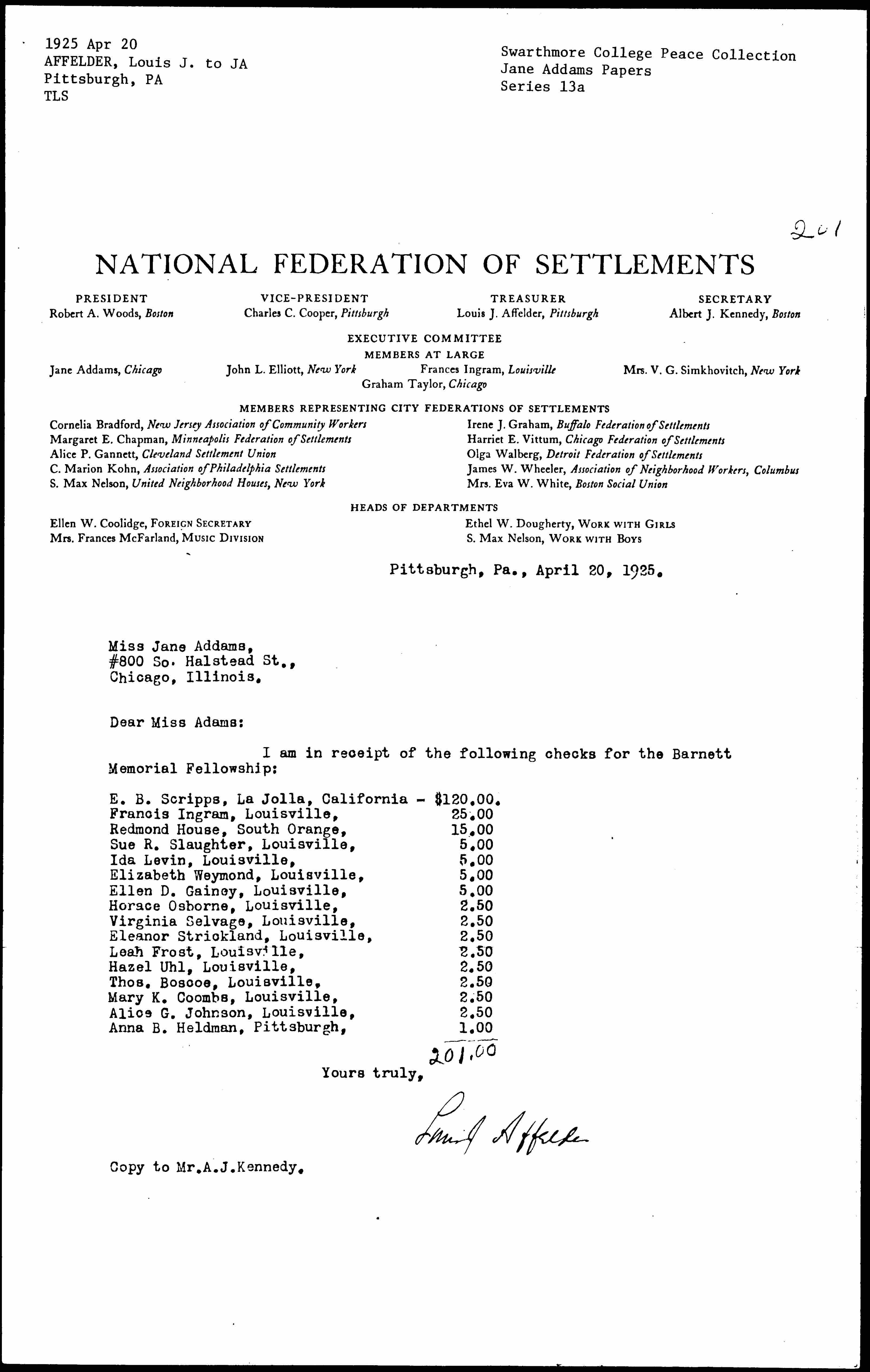 I am in receipt of the following checks for the Barnett Memorial Fellowship: