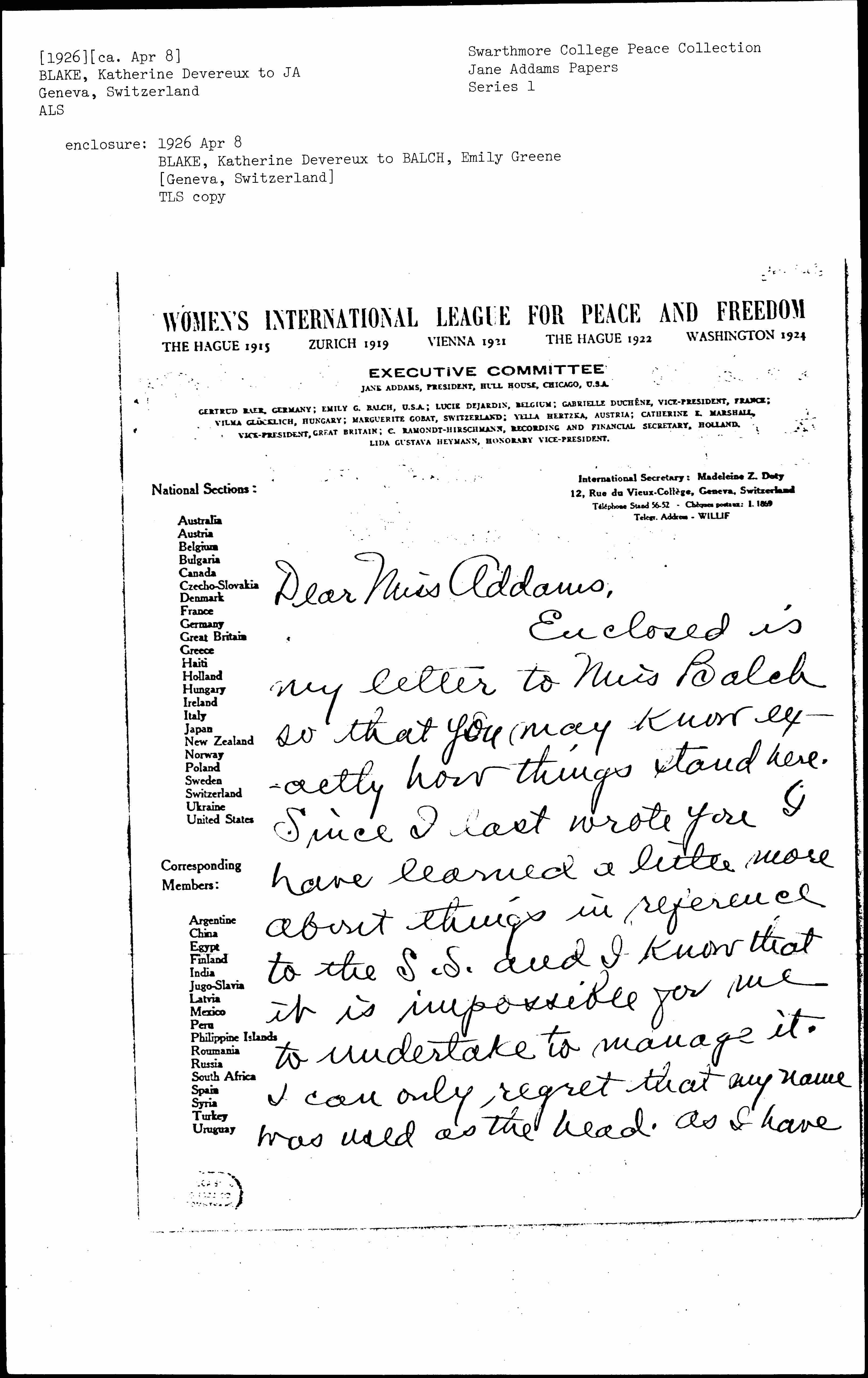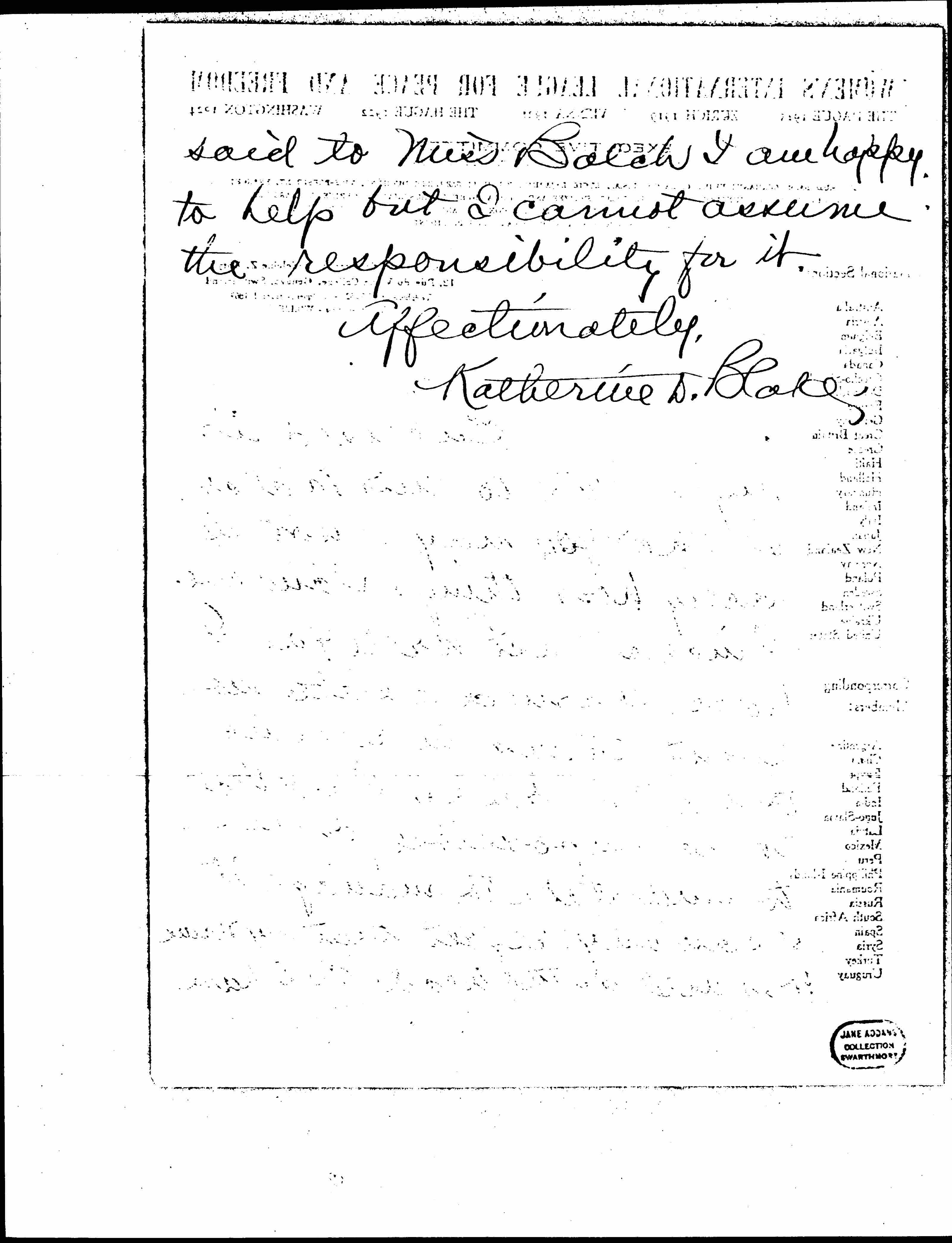 Enclosed is my letter to Miss Balch so that you may know exactly how things stand here. Since I last wrote you I have learned a little more about things in reference to the S.S. and I know that it is impossible for me to undertake to manage it. I can only regret that my name was used as the head. As I have [page 2] said to Miss Balch I am happy to help but I cannot assume the responsibility for it.
