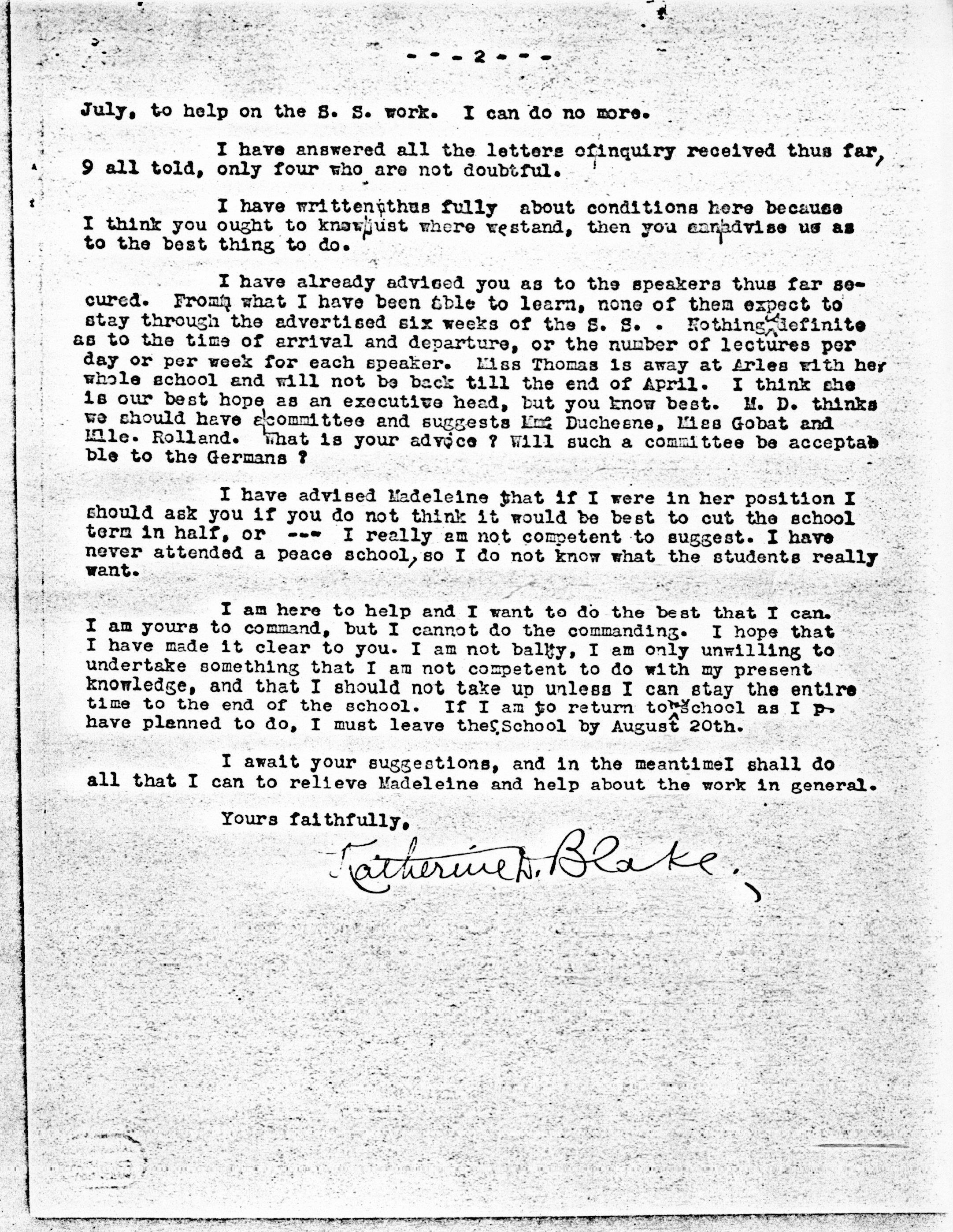 I have already advised you as to the speakers thus far secured. [From] what I have been able to learn, none of them expect to stay through the advertised six weeks of the S.S. Nothing ↑is↓ definite as to the time of arrival and departure, or the number of lectures per day or per week for each speaker. Miss Thomas is away at Arles with her whole school and will not be back till the end of April. I think she is our best hope as an executive head, but you know best. M. D. thinks we should have a committee and suggests Mme [Duchêne], Miss Gobat and Mlle. Rolland. What is your advice? Will such a committee be [acceptable] to the Germans?