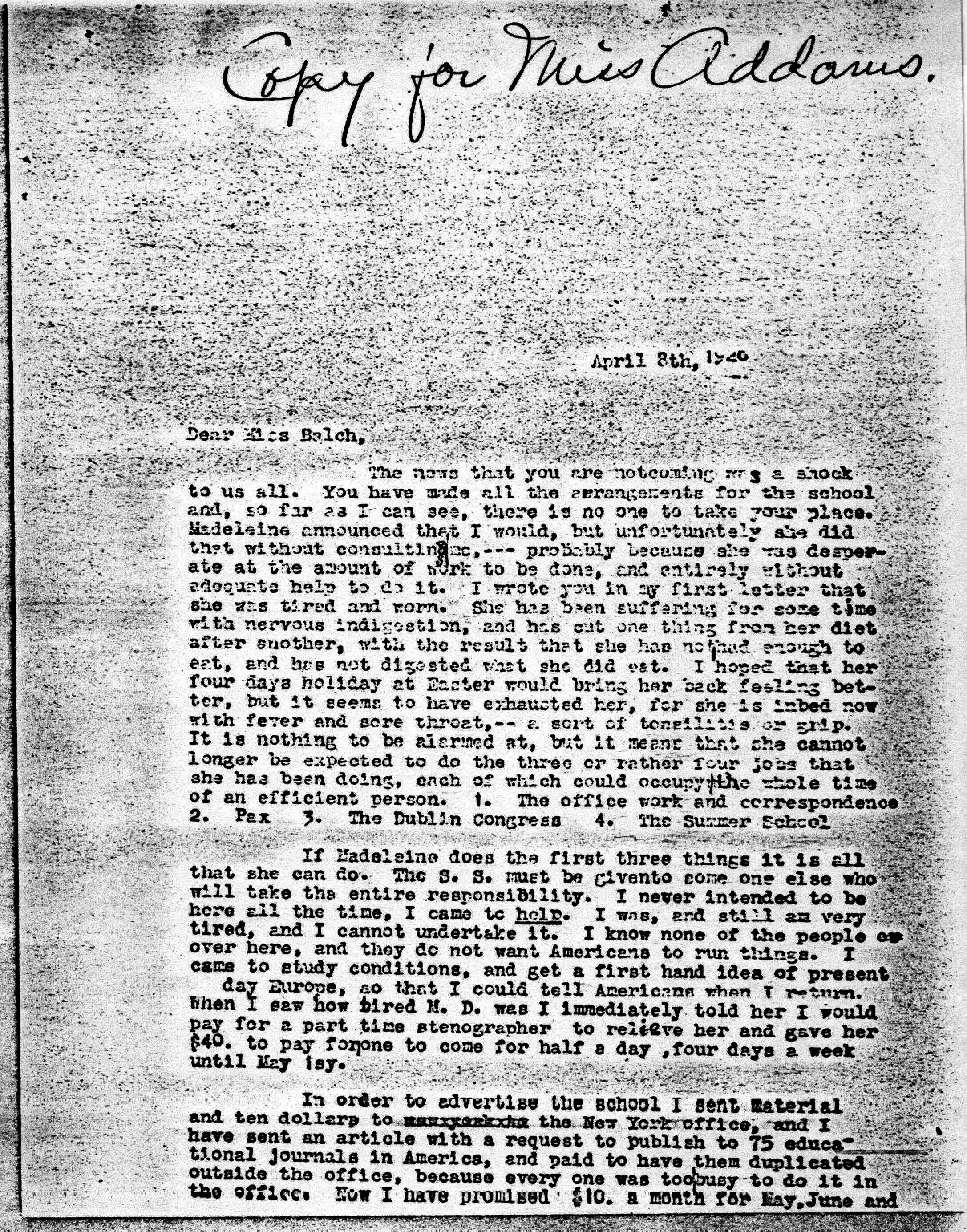 The news that you are not coming was a shock to us all. You have made all the arrangements for the school and, so far as I can see, there is no one to take your place. Madeleine announced that I would, but unfortunately she did that without consulting me, -- probably because she was desperate at the amount of work to be done, and entirely without adequate help to do it. I wrote you in my first letter that she was tired and worn. She has been suffering for some time with nervous indigestion, and has cut one thing from her diet after another, with the result that she has not had enough to eat, and has not digested what she did eat. I hoped that her four days holiday at Easter would bring her back feeling better, but it seems to have exhausted her, for she is [in bed] now with fever and sore throat, -- a sort of tonsillitis or grip. It is nothing to be alarmed at, but it means that she cannot longer be expected to do the three or rather four jobs that she has been doing, each of which could occupy the whole time of an efficient person. 1. The office work and correspondence 2. Pax 3. The Dublin Congress 4. The Summer School