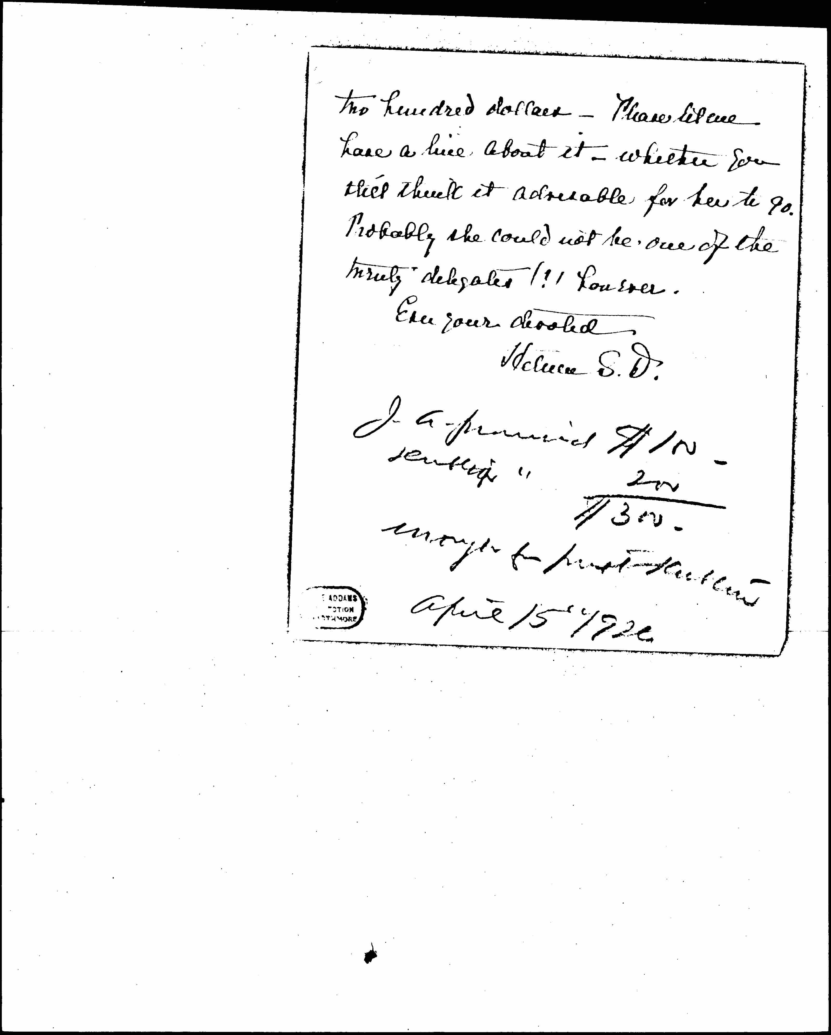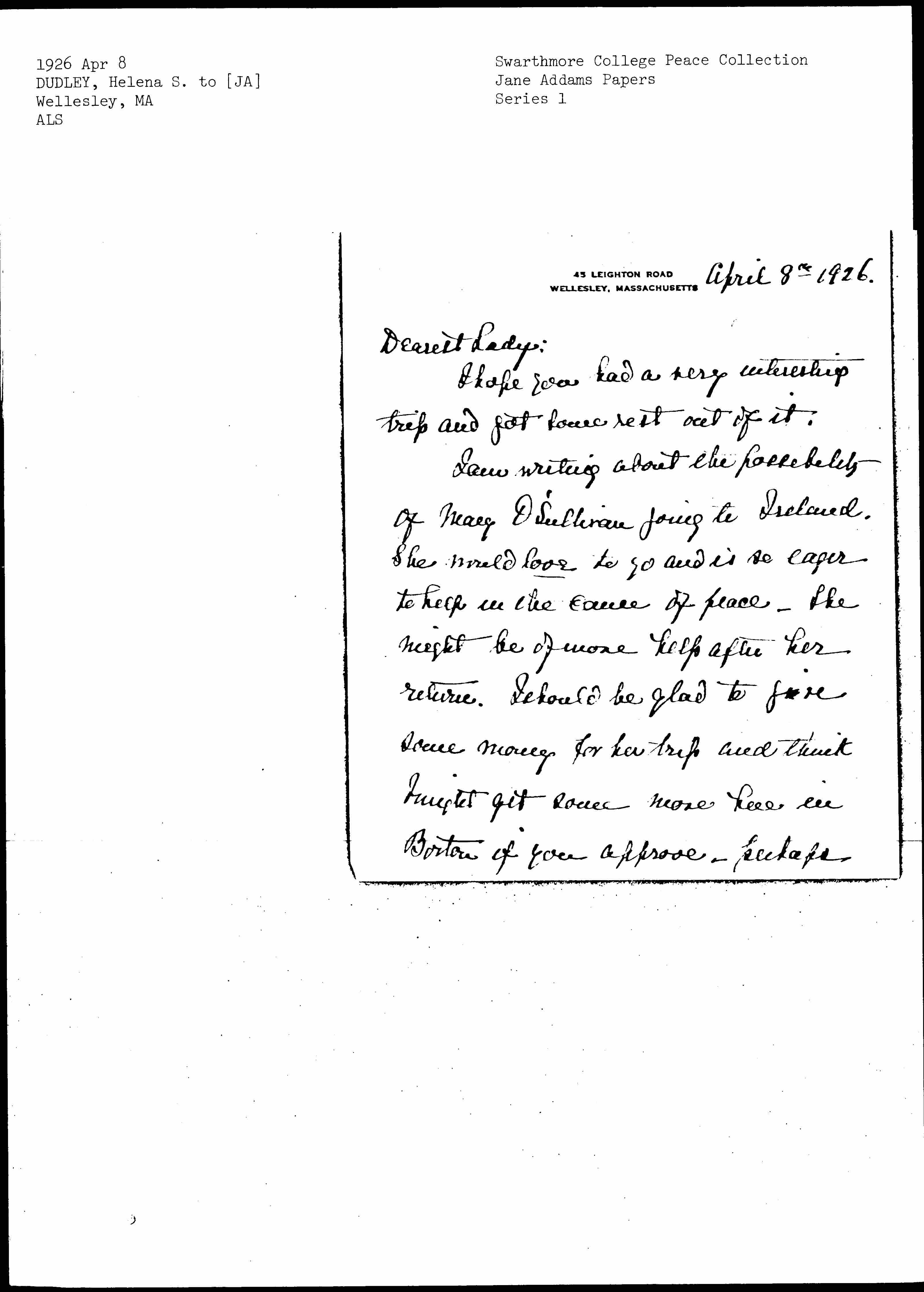 I am writing about the possibility of Mary O'Sullivan going to Ireland. She would love to go and is so eager to help in the cause of peace. She might be of more help after her return. I should be glad to give some money for her trip and think I might get some more here in Boston if you approve -- perhaps [page 2] two hundred dollars. Please let me have a line about it -- whether you still think it advisable for her to go. Probably she could not be one of the twenty delegates (?) however.