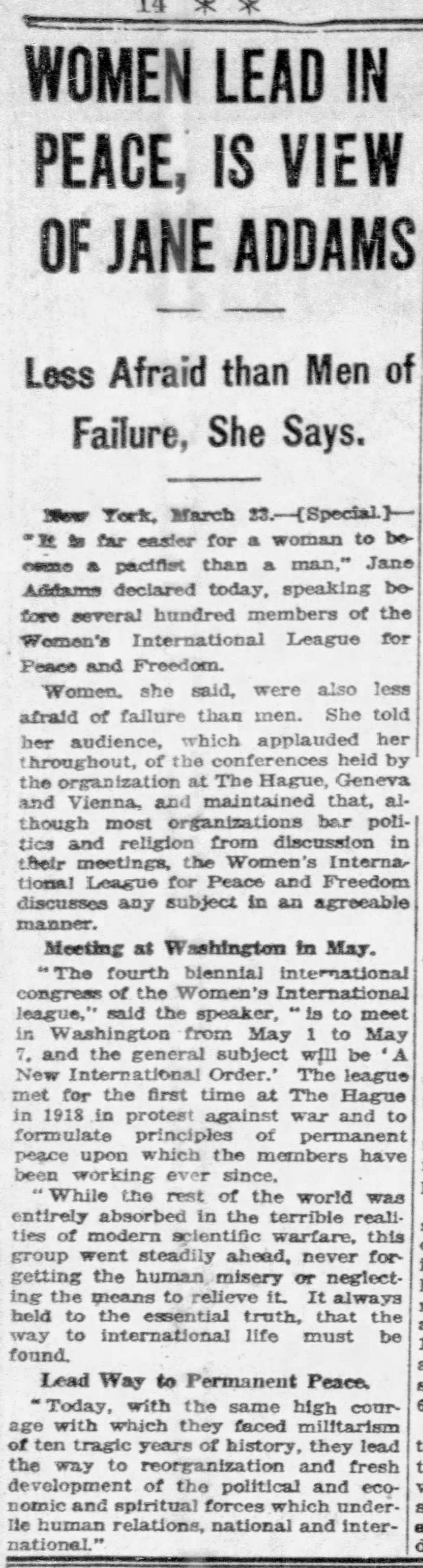WOMEN LEAD IN PEACE, IS VIEW OF JANE ADDAMS