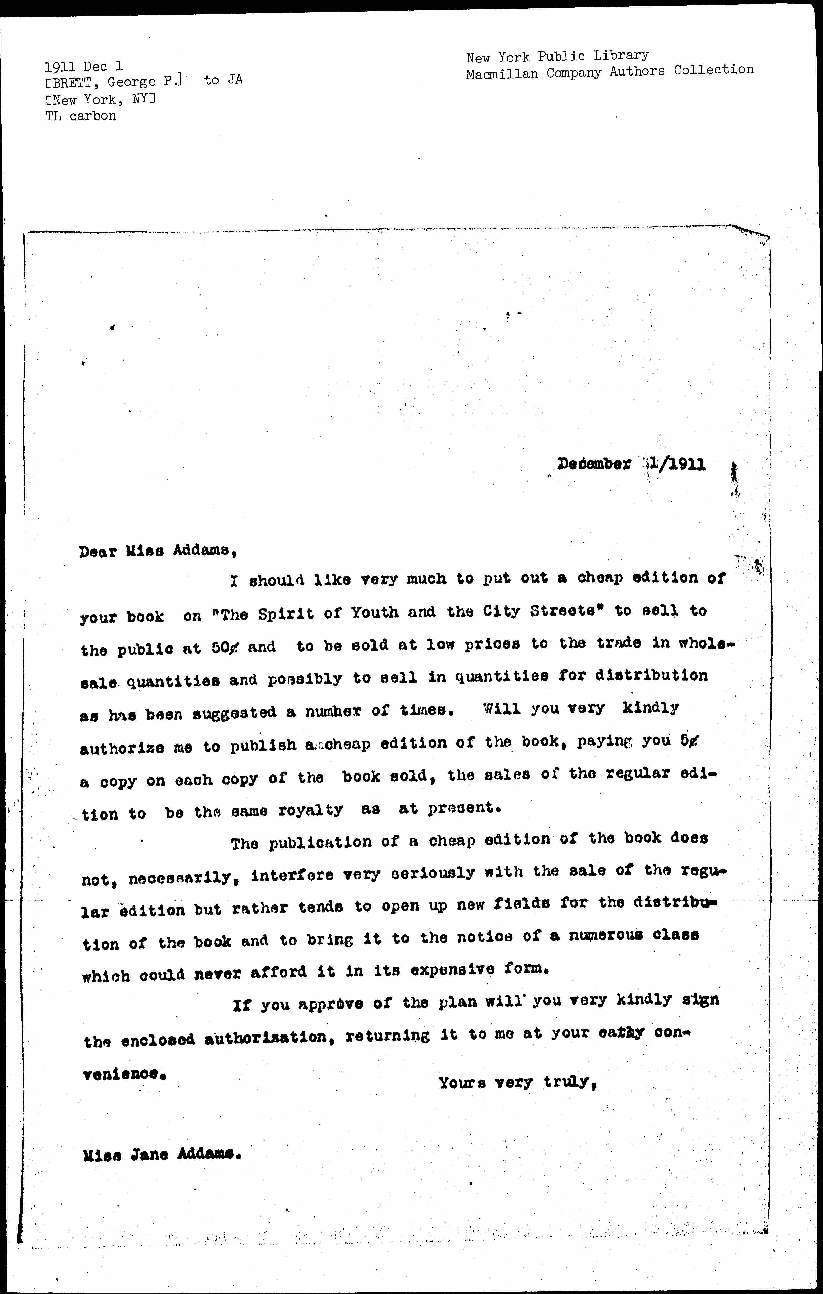 I should like very much to put out a cheap edition of your book on "The Spirit of Youth and the City Streets" to sell to the public at 50₵ and to be sold at low prices to the trade in wholesale quantities and possibly to sell in quantities for distribution as has been suggested a number of times. Will you very kindly authorize me to publish a cheap edition of the book, paying you 5₵ a copy on each copy of the book sold, the sales of the regular edition to be the same royalty as at present.
