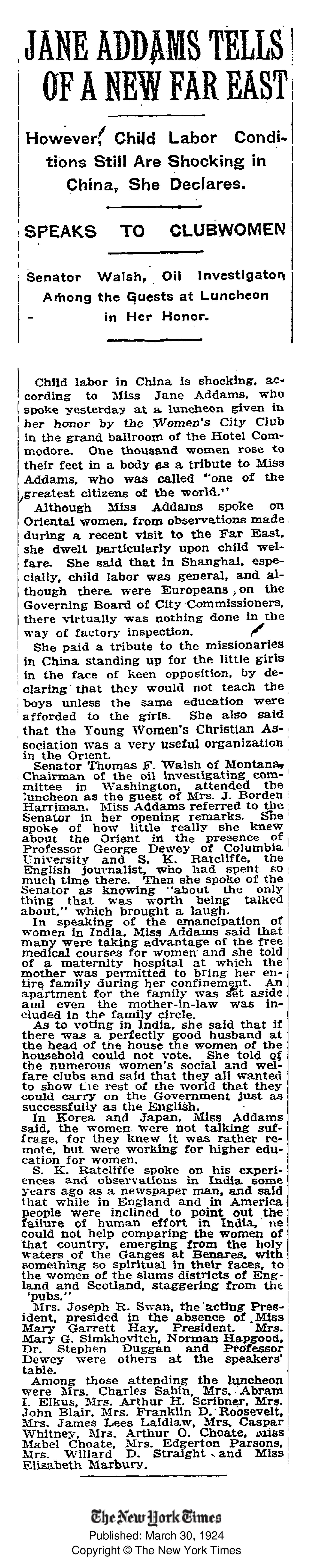 Senator Thomas [J.] Walsh of Montana, Chairman of the oil investigating committee in Washington, attended the luncheon as the guest of Mrs. J. Borden Harriman. Miss Addams referred to the Senator in her opening remarks. She spoke of how little she really knew about the Orient in the presence of Professor [John] Dewey of Columbia University and S. K. Ratcliffe, the English journalist, who had spent so much time there. Then she spoke of the Senator as knowing "about the only thing that was worth being talked about," which brought a laugh.