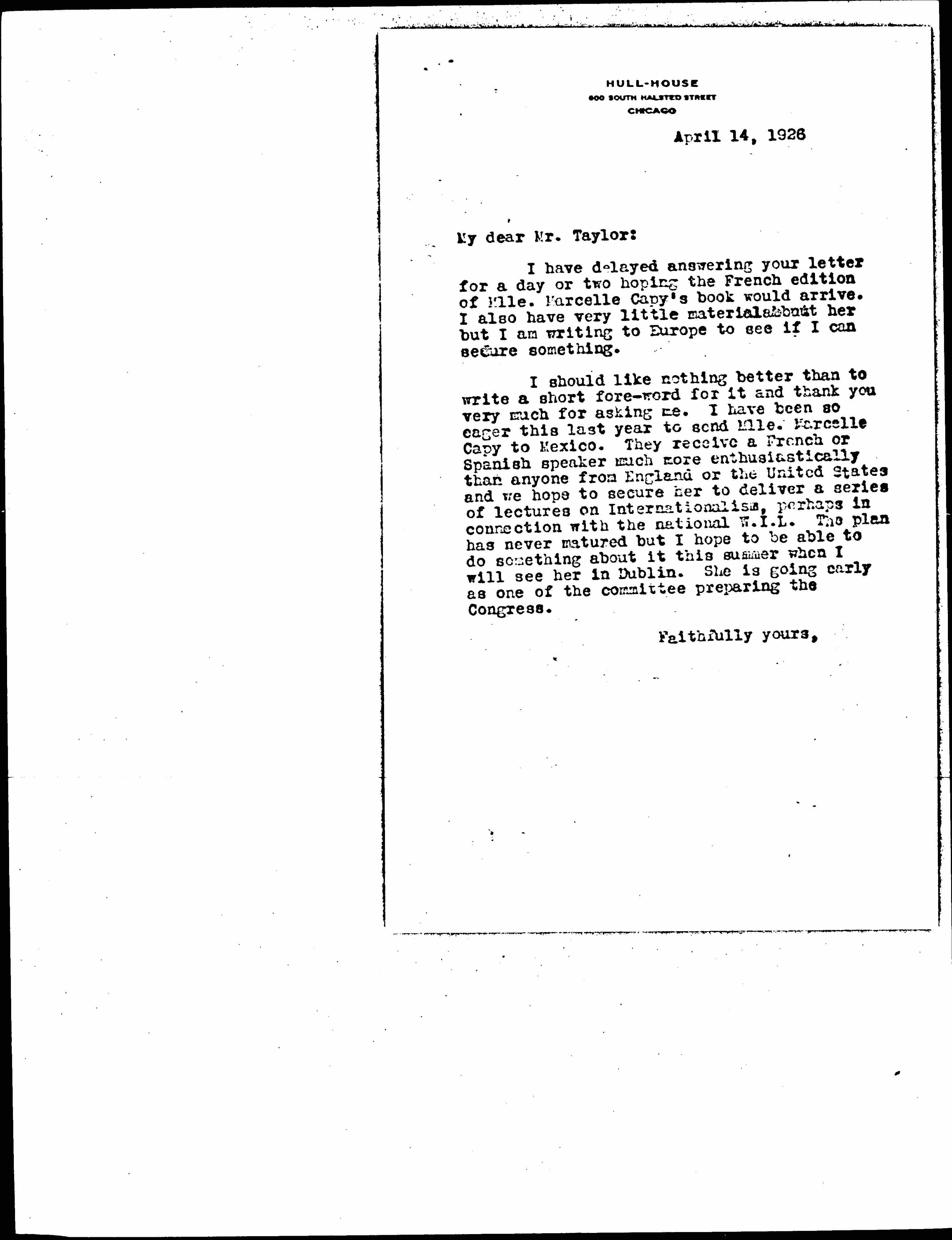 I should like nothing better than to write a short [foreword] for it and thank you very much for asking me. I have been so eager this last year to send Mlle. Marcelle Capy to Mexico. They receive a French or Spanish speaker much more enthusiastically than anyone from England or the United States and we hope to secure her to deliver a series of lectures on Internationalism, perhaps in connection with the national W.I.L. The plan has never matured but I hope to be able to do something about it this summer when I will see her in Dublin. She is going early as one of the committee preparing the Congress.
