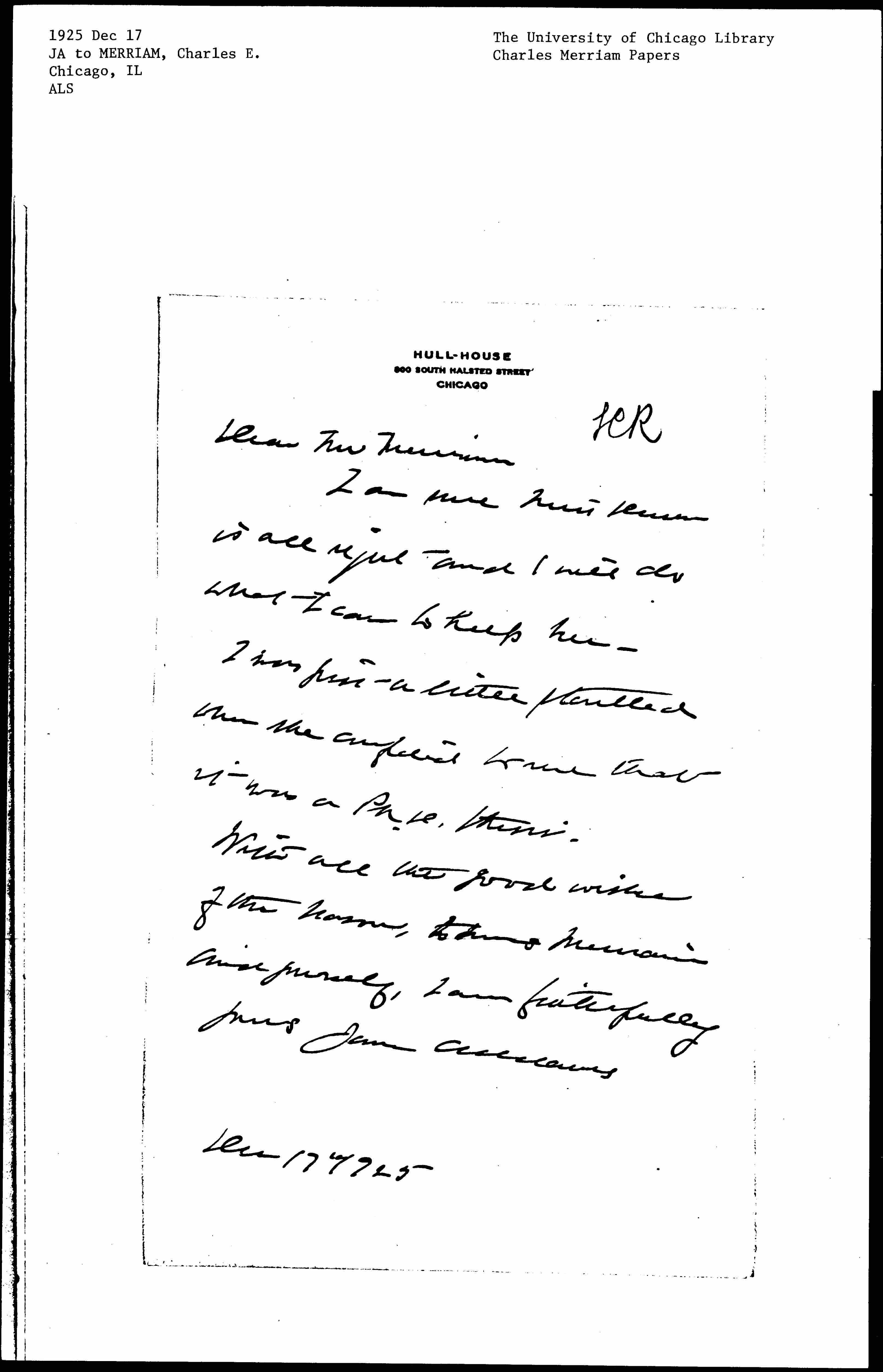 With all the good wishes of the season, to Mrs Merriam and yourself, I am faithfully yours Jane AddamsDec 17" 1925