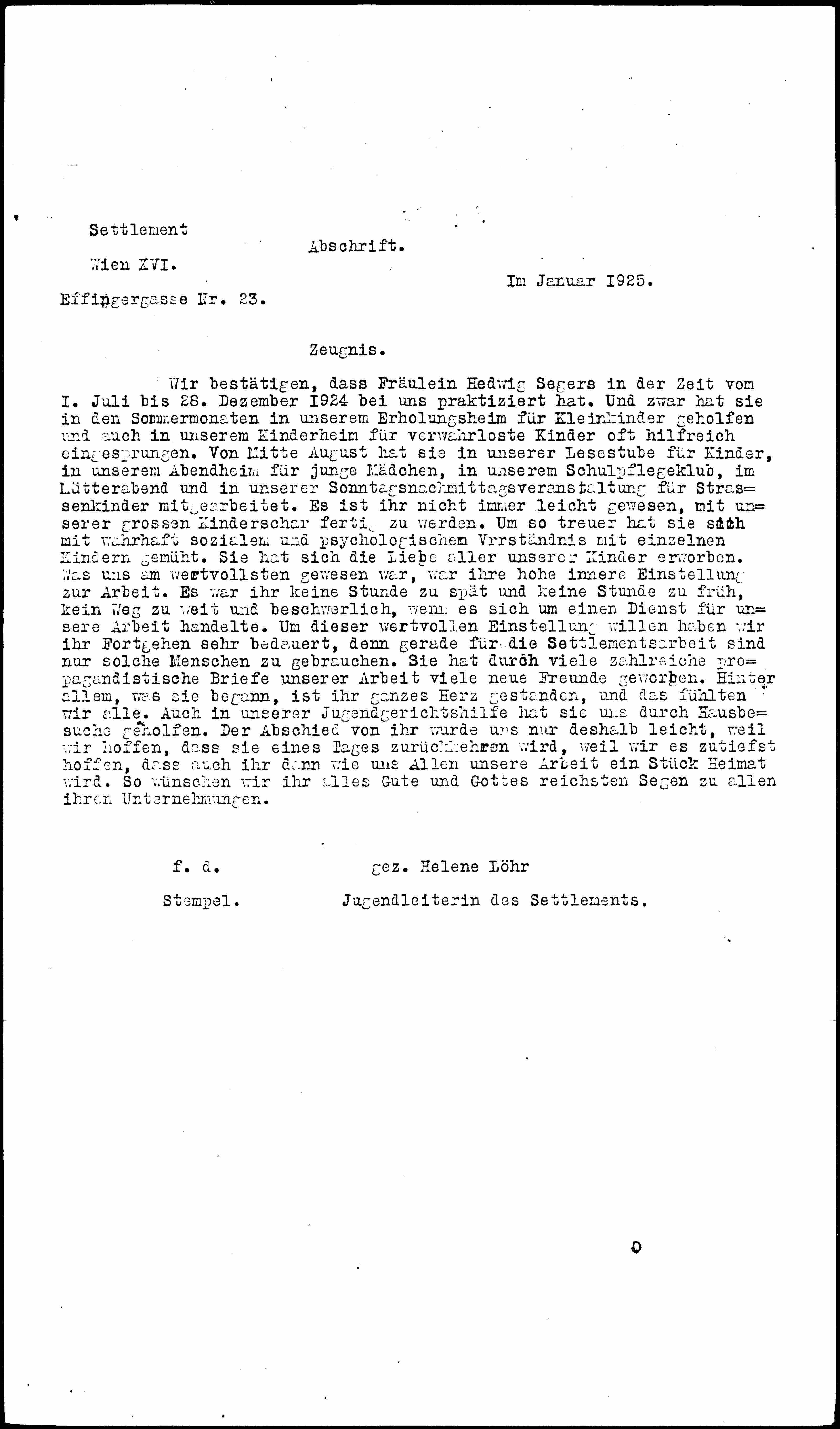 We confirm that Miss Hedwig Segers practiced with us in time from July 1st to December 28th, 1924. In fact, she helped in the summer months in our convalescent home for small children and also often helped in our children's home for neglected children. From mid-August she has worked in our children's reading room, our young girls' night home, our school nursing club, the Lütter evening and our Sunday afternoon event for street children. It was not always easy for her to cope with our large group of children. She is all the more loyal [illegible] worked with individual children with true social and psychological understanding. She earned the love of all our children. What we valued most was her high attitude towards work. It was not an hour too late and not an hour early for her, no way too far and difficult when it came to a service for our work. For the sake of this valuable attitude, we very much regretted her departure, because only such people can be used for settlement work. She has gained many new friends through many numerous propagandistic letters about our work. Her whole heart was behind everything she started and we all felt that. She also helped us with home visits in our juvenile court service. Saying goodbye to her was only easy for us because we hope that one day she will return, because we deeply hope that then, like all of us, our work will become a piece of home for her. So we wish her all the best and God's richest blessings in all her endeavors.