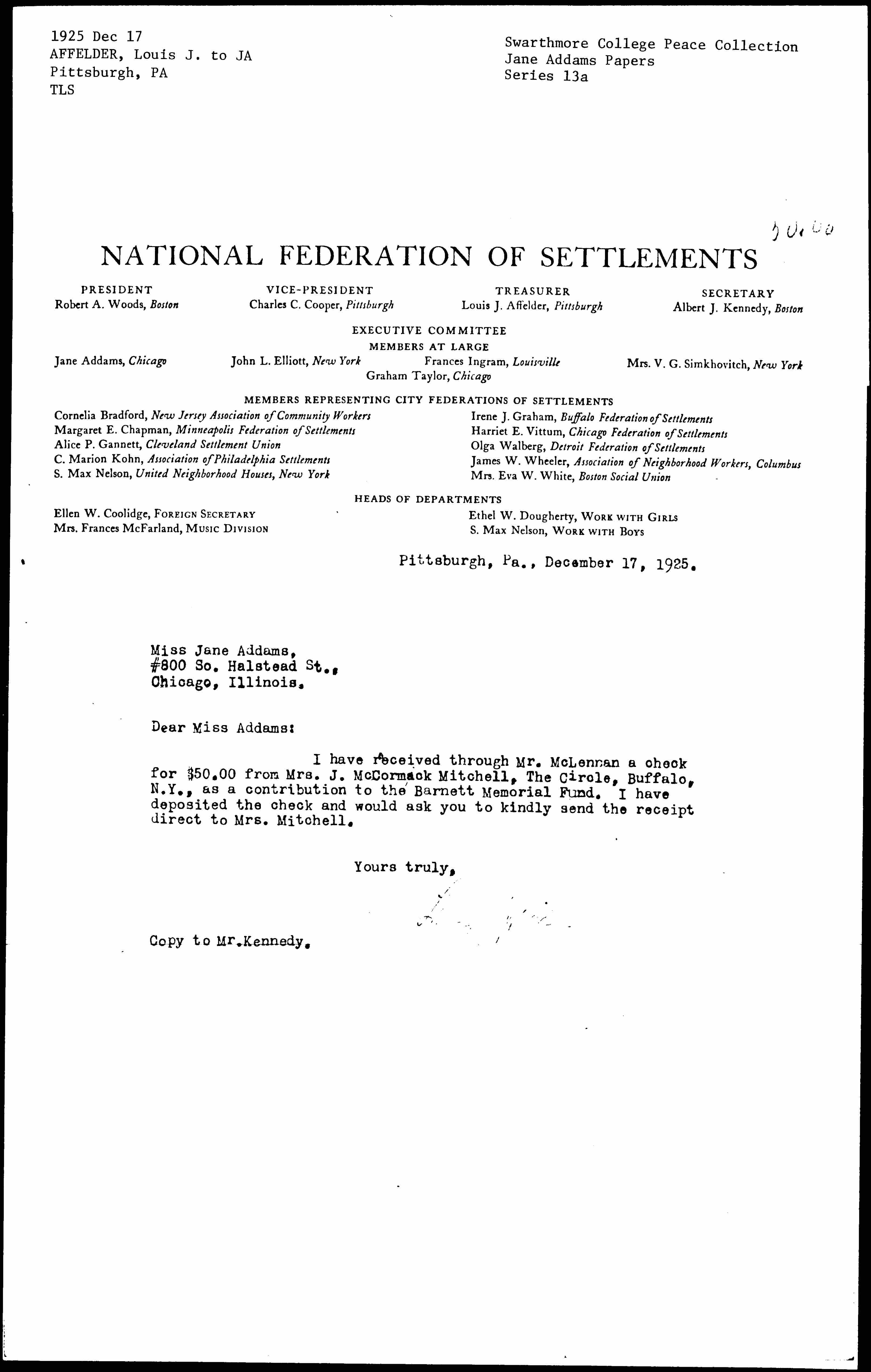 I have received through Mr. McLennan a check for $50.00 from Mrs. J. [McCormick] Mitchell, The Circle, Buffalo, N.Y., as a contribution to the Barnett Memorial Fund. I have deposited the check and would ask you to kindly send the receipt direct to Mrs. Mitchell.