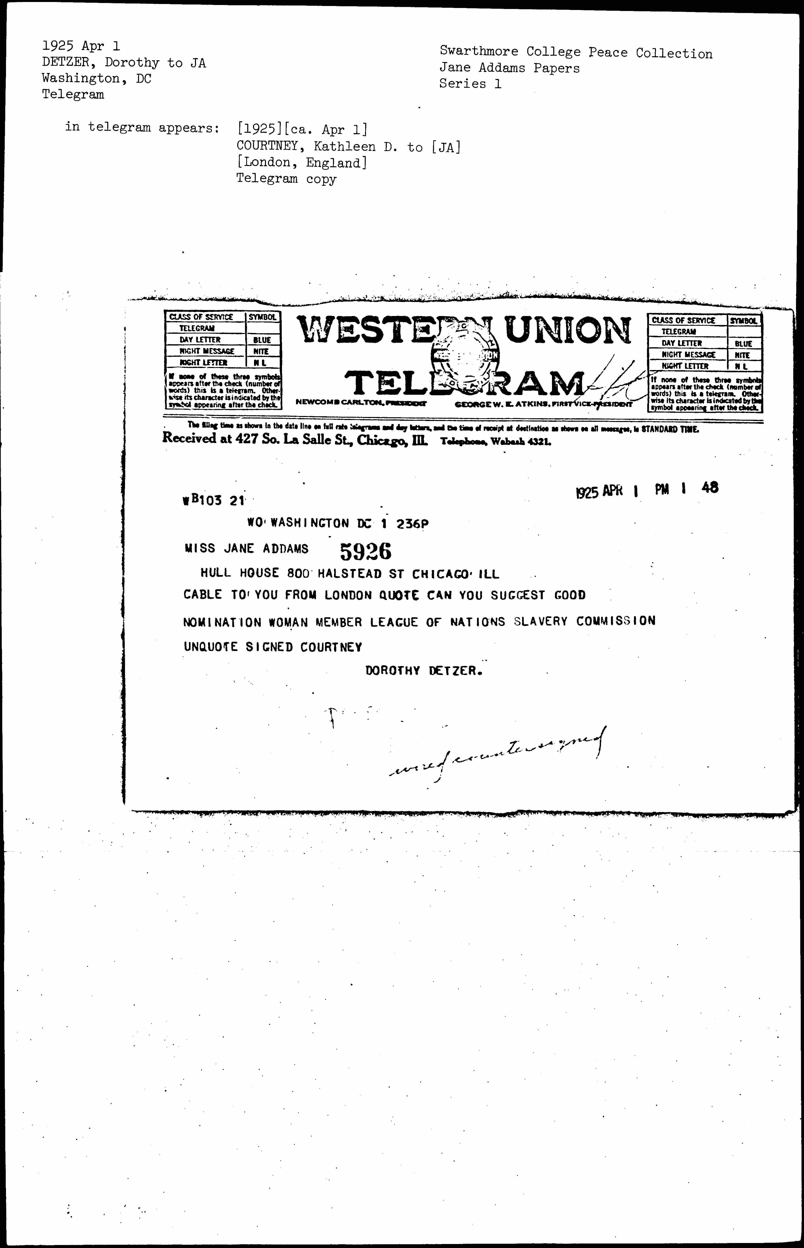 CABLE TO YOU FROM LONDON "CAN YOU SUGGEST GOOD NOMINATION WOMEN MEMBER LEAGUE OF NATIONS SLAVERY COMMISSION" SIGNED COURTNEY