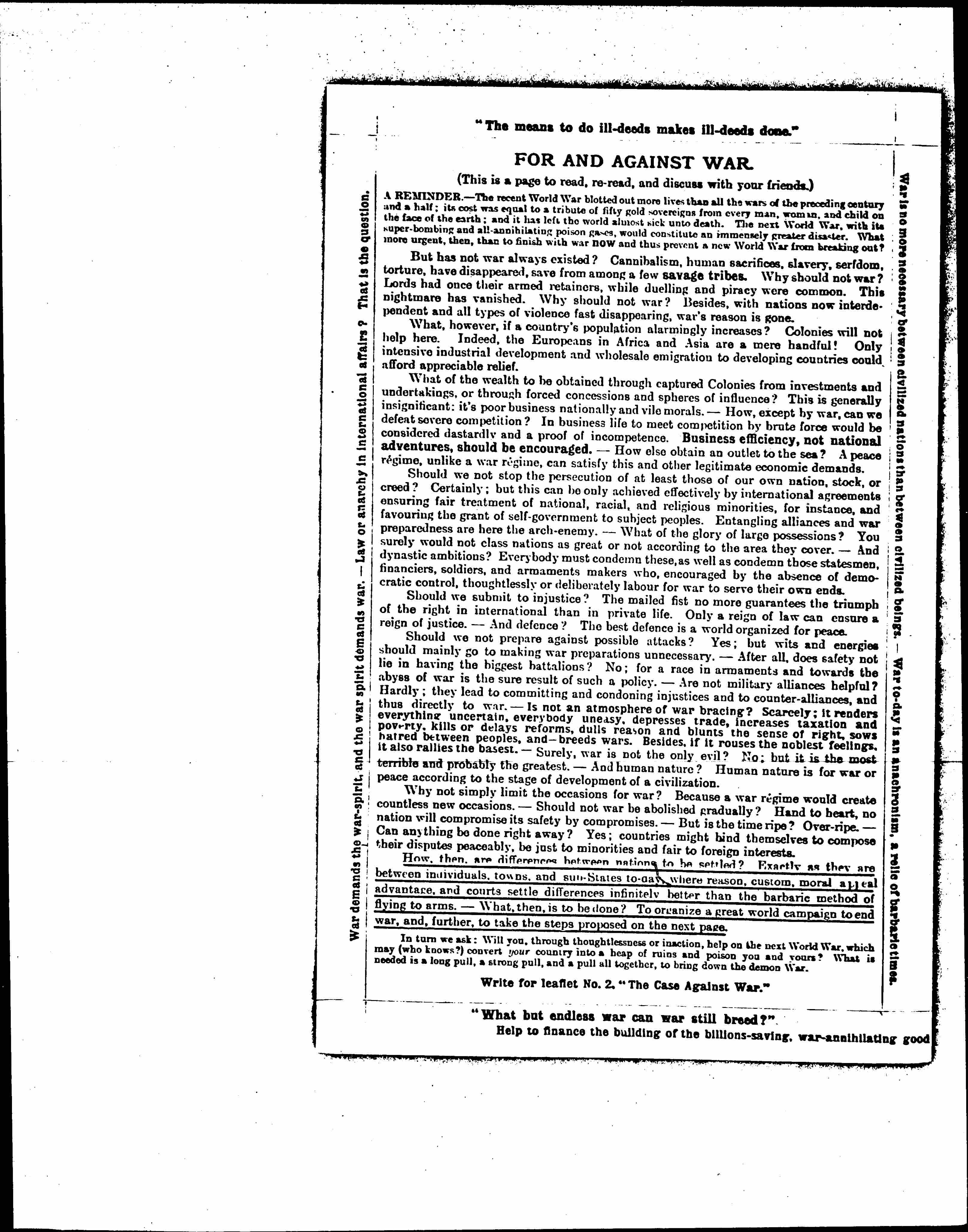 The question, then, is: Shall we risk another World War, far more terrible than the last, in order to be able to snatch some miserable advantage here or there, or shall we, here and now, decide to bring to an end the reign of war within the next half-a-dozen years or so? As a civilized being, your duty is clear -- alongside of others, of all classes, nations, and races -- to work with all your might for the immediate abolition of war by the means outlined in this leaflet. Remember that a seven years' concentrated and determined world attack on war is likely to achieve far more than seventy years of fitful agitation now in this and then in that country, with great wars intervening. Remember too, that because of the growing interdependence of nations, the only alternative to ending war altogether is a succession of ever fiercer world wars withering our civilization root and branch and converting flourishing countries into dreary deserts. In view of this, it is a sacred duty or patriotic men and women to encourage only peaceful national polities, it being certain that their country, in forswearing war, will but sacrifice unprofitable illusions.}