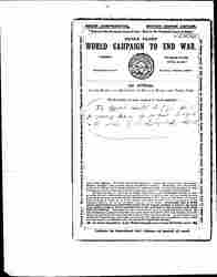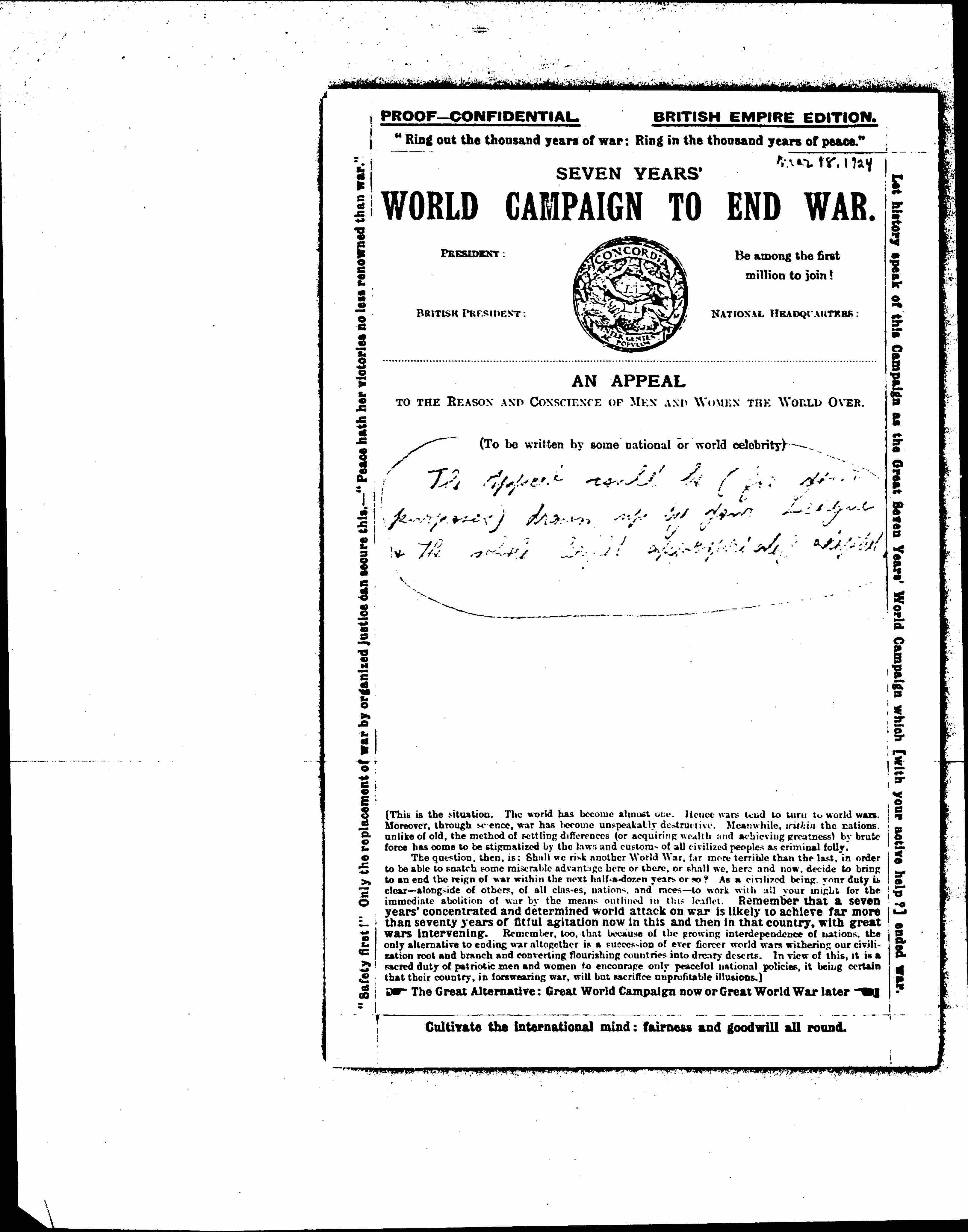 [written along the edges of the page] "Ring out the thousand years of war; Ring in the thousand years of peace." Let history speak of this Campaign as the Great Seven Years' World Campaign which {with your active help?} ended war. Cultivate the international mind; fairness and goodwill all round. "Safety first!" Only the replacement of war by organized justice can secure this. -- "Peace hath her victories no less renowned than war." [page 2]