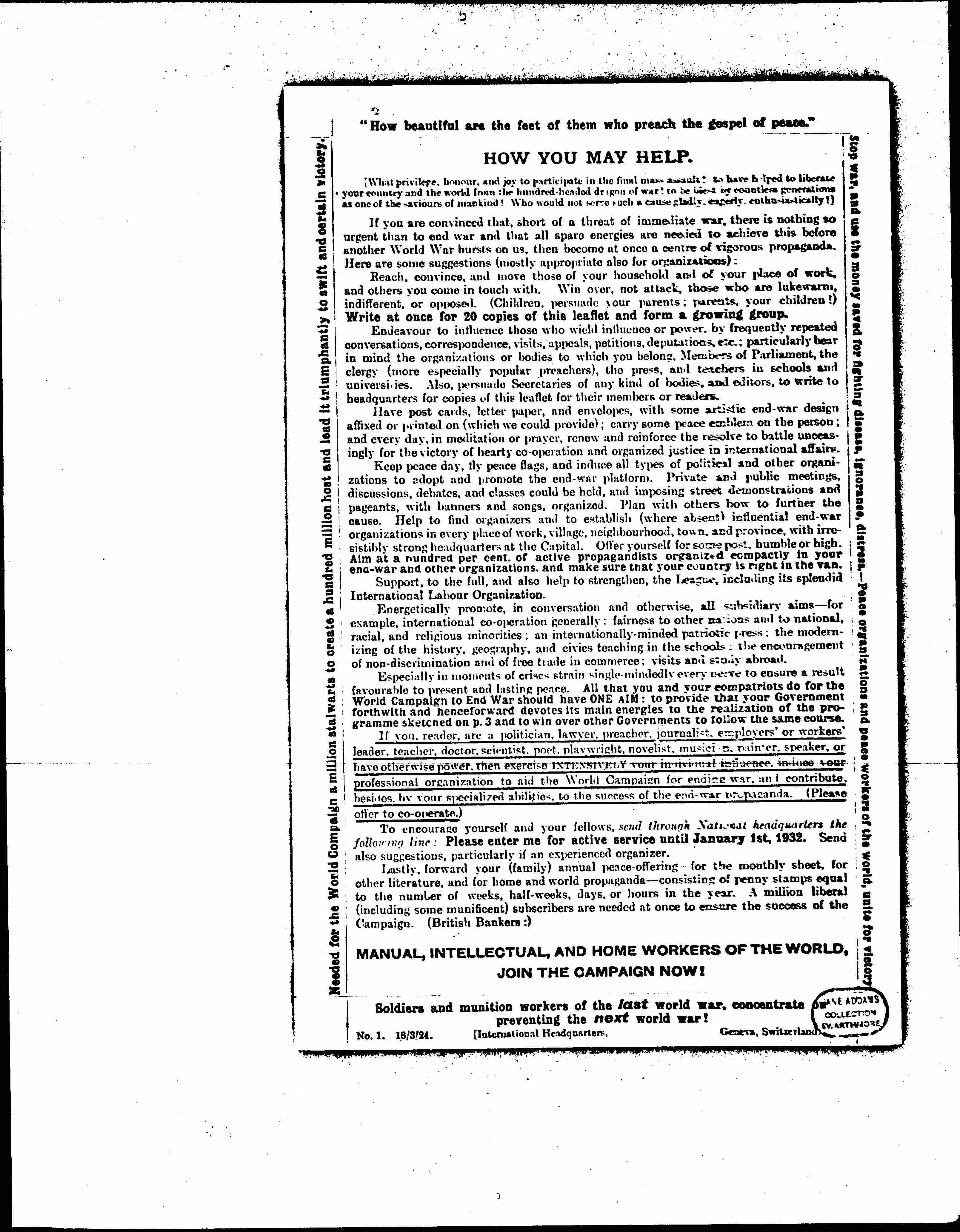 [written along the edges of the page: "How beautiful are the feet of them who preach the gospel of peace." Stop war, and use the money saved for fighting disease, ignorance, distress. -- Peace organizations and peace workers of the world, unite for victory. Soldiers and munition workers of the last world war, concentrate on preventing the next world war! Needed for the World Campaign a million stalwarts to create a hundred million host and lead it triumphantly to swift and certain victory.]