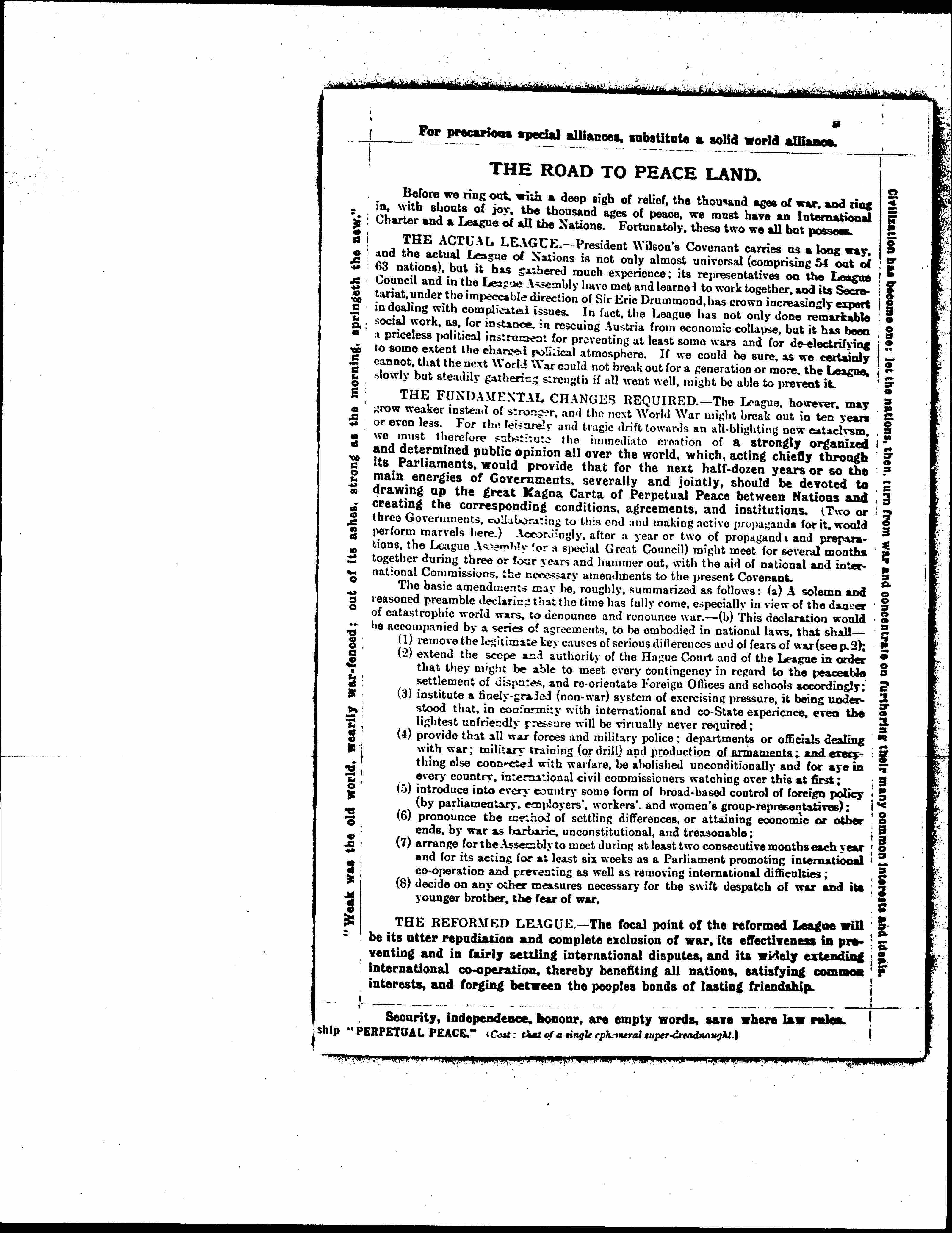 THE REFORMED LEAGUE. -- The focal point of the reformed League will be its utter repudiation and complete exclusion of war, it's effectiveness in preventing and in fairly settling international disputes, and its widely extending international [cooperation], thereby benefitting all nations, satisfying common interests, and forging between the peoples bonds of lasting friendship.